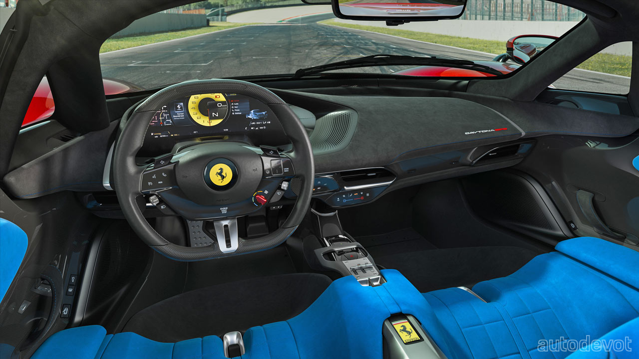 New Pirelli P Zero Corsa tyres were specifically developed for the Daytona SP3, which are said to be optimized for both dry and wet performance with a particular focus on the car’s stability in low grip situations. The new Icona is also equipped with the latest version of Ferrari’s SSC 6.1—which, for the first time on a mid-rear-engined V12, includes the FDE (Ferrari Dynamic Enhancer) to enhance cornering performance. This lateral dynamics control system acts on the brake pressure at the calipers to control the car’s yaw angle in on-the-limit driving and can be activated in ‘Race’ and ‘CT-Off’ modes on the Manettino. The wheels are 20-inch at the front and 21-inch at the rear. The discs measure 398 mm at the front and 380 at the rear.