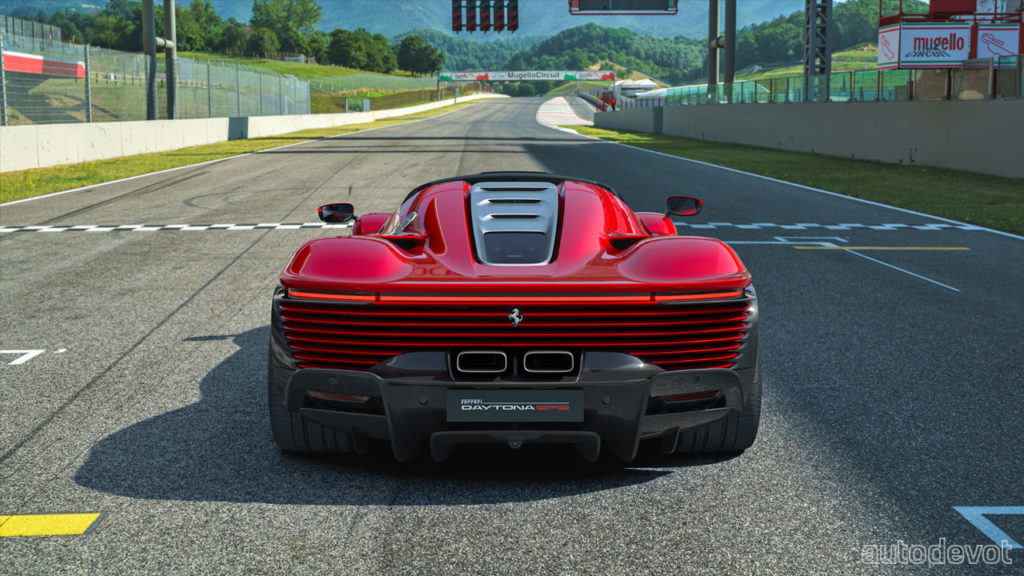 Indeed, Chief Design Officer Flavio Manzoni and his Styling Centre team have done a fantastic job in sculpting the Daytona SP3—mixing the past and present bits. The front wings are a nod to the aforementioned past Ferrari sports prototypes such as the 512 S, 712 Can-Am and 312 P. The wings feature outer and inner crests; the latter dive into two air vents on the bonnet, making the wings appear wider. Another key element is the butterfly doors, which have an integrated air box to channel air into the side-mounted radiators. The wing mirrors have been literally moved to the top of the wings, recalling again the sports prototypes of the 1960s; in fact, that position was chosen so that the door intakes won’t get blocked. The rear-end mimics the wings and heat sink-like 3D lines of the front. The rear fascia might remind you of the Testarossa; kinda like a modern take on that.