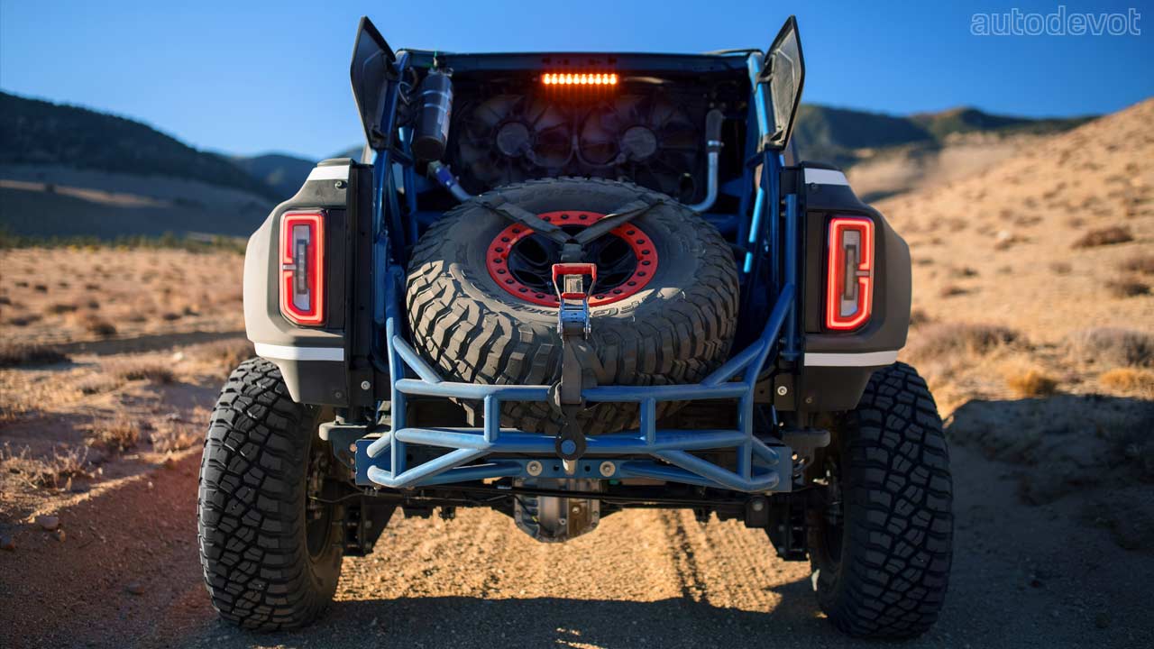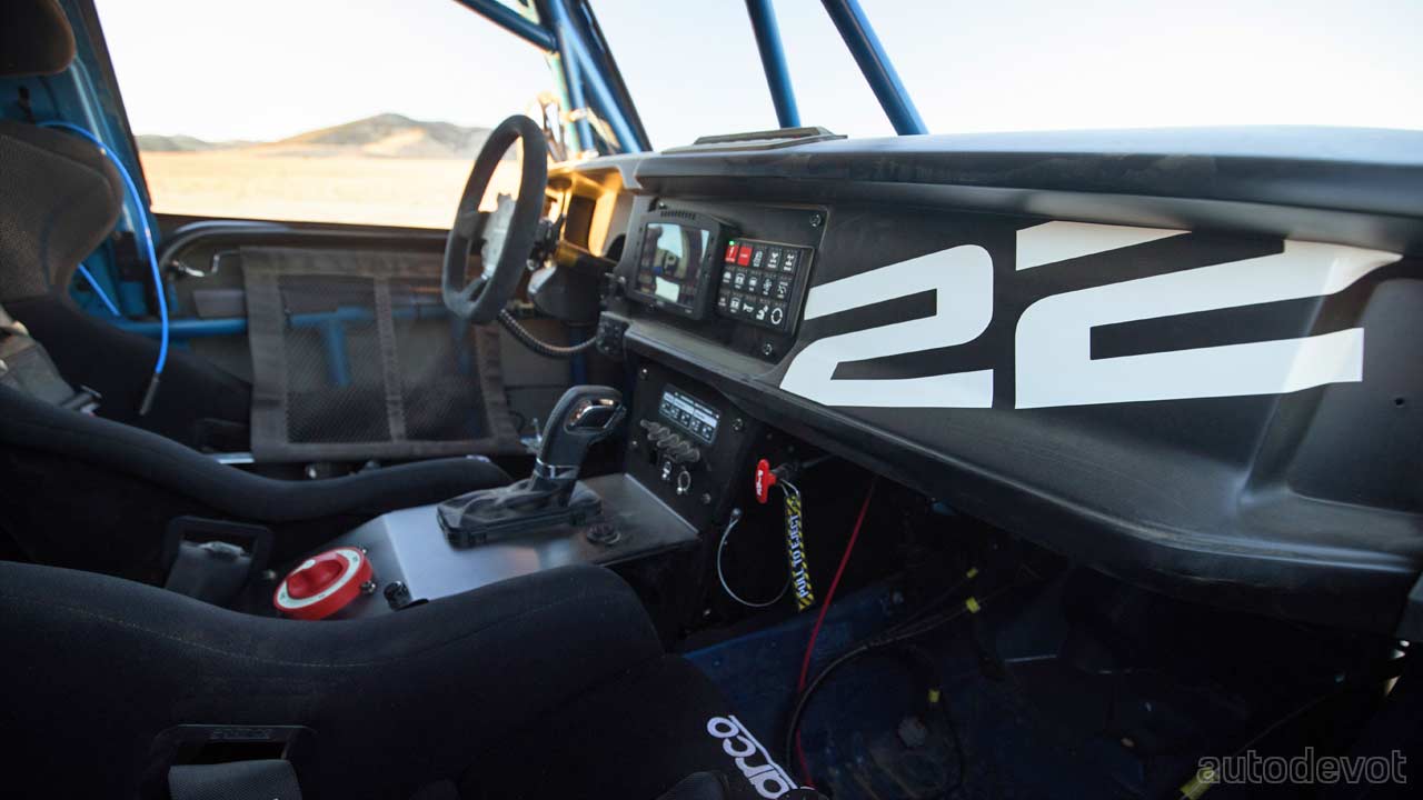 A 65-gallon (246-litre) fuel tank rides below the cargo area. The Bronco DR carries over the disc brakes from the production Bronco and adds upgraded pads, while the electric power-assisted steering system with upgraded inner tie rod joints makes for increased articulation, Ford said. Also, Ford is targeting a race weight of about 6,200 lbs (2,812 kg).