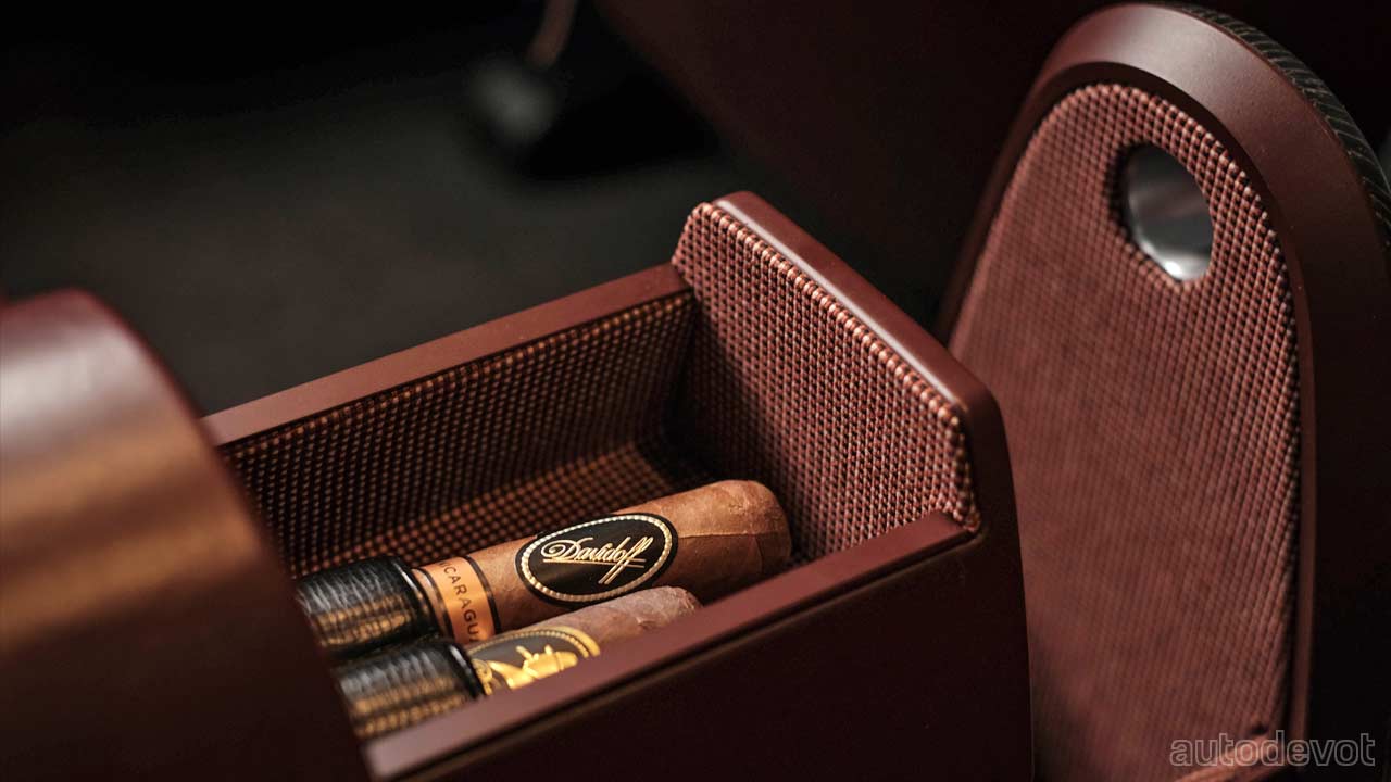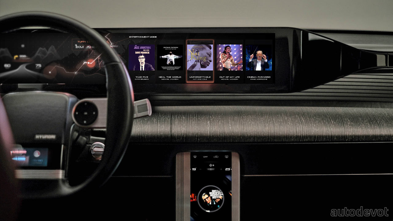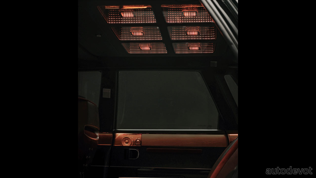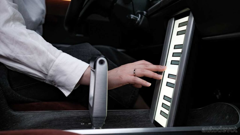 For the cabin, the designers applied a “Newtro” (newness + retro) theme—combining bronze-colored lighting that is reminiscent of period audio equipment, and a modern sound system—an 18-speaker sound system tuned by South Korean sound designer Guk-il Yu. There’s also a piano function that can be enjoyed when the vehicle is parked. The front seats are upholstered with burgundy velvet—inspired by the original Grandeur, combined with Nappa leather on the back with shoe-like laces—which is my personal favorite design element inside. There are, of course, digital displays at the front, and also, notice an aircraft thrust lever-like gear selector.