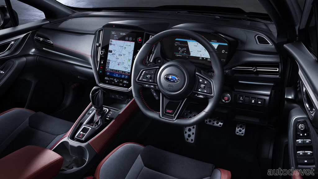 The STI cockpit looks a lot more sporty, thanks to the STI-branded flat-bottom steering wheel, red contrast stitching and Bordeaux-Black theme throughout. The Recaro front seats you’re seeing here is a factory option. Also, notice a 12.3-inch LCD instrument cluster which comes standard in EX trims.