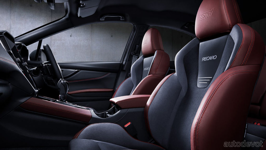 The STI doesn’t get any special performance upgrades compared with other trims in the lineup. The 2.4L 4-cylinder turbocharged Boxer engine offers the same 202 kW (275 metric hp/271 bhp) and 350 Nm (258 lb-ft) of torque as the global model. However, the Japs are not getting the manual offered in the US market. The engine is hooked up with a CVT and an AWD system. The STI models get ZF electronically controlled dampers.