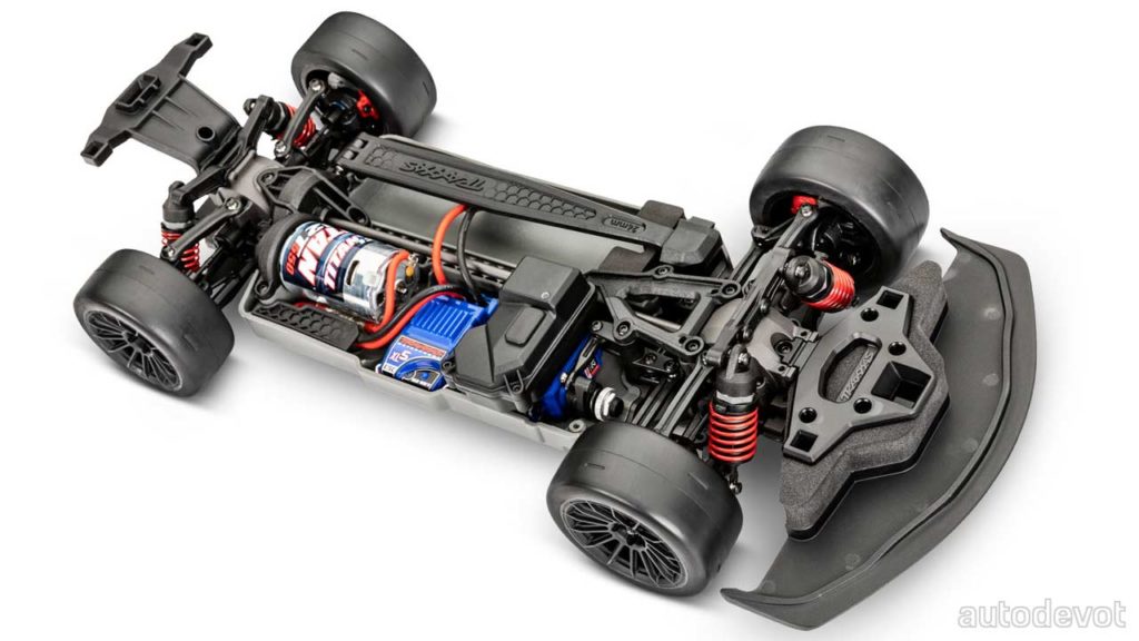 The detailing on the bodywork is pretty close to the real one; the body mounts onto the chassis via a clipless mounting system with an integrated quick release latch system. Speaking of the chassis, Traxxas modified its 4-Tec platform into 4-Tec 3.0 with a longer wheelbase and wider tracks specifically for the Supra GT4. Notice the wide racing slicks wrapped to 2.0-inch multi-spoke wheels.