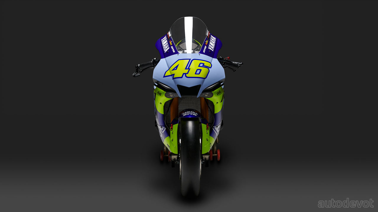 Yamaha is celebrating Valentino Rossi’s legendary MotoGP career—which included nine world championship titles across the MotoGP, 250 cc and 125 cc classes, 115 wins, and 235 podiums over 425 race starts, with a special R1 GYTR VR46 Tribute. The racing motorcycle is a one-off and dons a special livery produced by Aldo Drudi—Rossi’s long-time helmet designer and friend.
