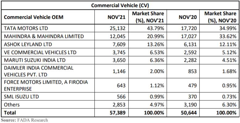 The Federation of Automobile Dealers Associations (FADA) has published November 2021 vehicle retail data, which shows an overall decline of 2.70% compared with November 2020 data. The Passenger Vehicle segment, in particular, saw a YoY decline of nearly 19.5%. And, this time, again, Mahindra & Mahindra reclaimed its 4th place in the PV segment by selling over 5,000 units more than Kia.