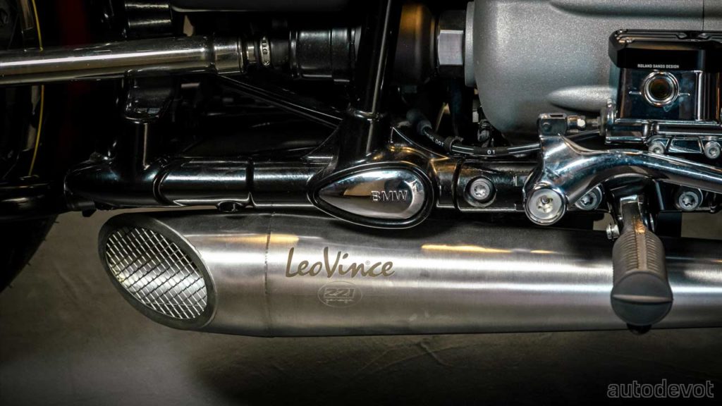 As for the R 18 Aurora, the saddle was borrowed in its entirety from a 2005 BMW 1200 C, the Batwing supports were made using the supports for indicators of a 1982 BMW R 100 and a part of the rear frame of a 1991 BMW K 75. The front and rear fender supports, saddle supports, and license plate holder arms are entirely handmade. The body color was inspired by a 1983 BMW RT 100. The exhaust pipes were made in collaboration with Leo Vince.