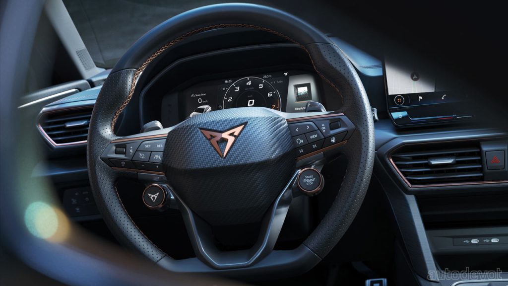 Speaking of which, on the exterior, the Leon VZ CUP features carbon fibre inserts on the rear spoiler (for hatch only); Dark Alu side skirts, and optional mirror covers in carbon fibre. Also, the tailpipes are circular as opposed to squarish copper in the “regular” Cupra Leon. But most importantly, the 19-inch alloy wheels with copper finishing are the ones that give the special Leon its special looks. The wheels can be wrapped with Bridgestone performance tires.