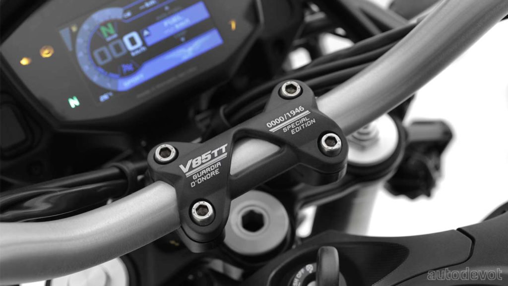 Limited to 1,946 units, the special motorcycle features a livery similar to the V85 TT motorcycles delivered to the Head of State at the Quirinal Palace. The white decorations run along the front mudguard, continuing onto the fuel tank and the side panels and they are also picked up on the oversized Touring windscreen. While the centre stand, the engine guard bars and the supplementary LED lights are standard, a pair of side panniers dedicated to this model are available on request. Buyers of this special V85 TT will also receive a celebratory case which includes a brochure with the history of Moto Guzzi motorcycles used by the Cuirassiers and a stamp collector’s folder containing the postmarked stamp issued on the occasion of the Moto Guzzi Centennial.