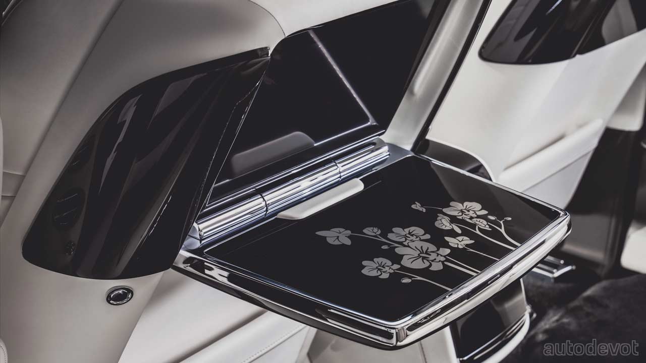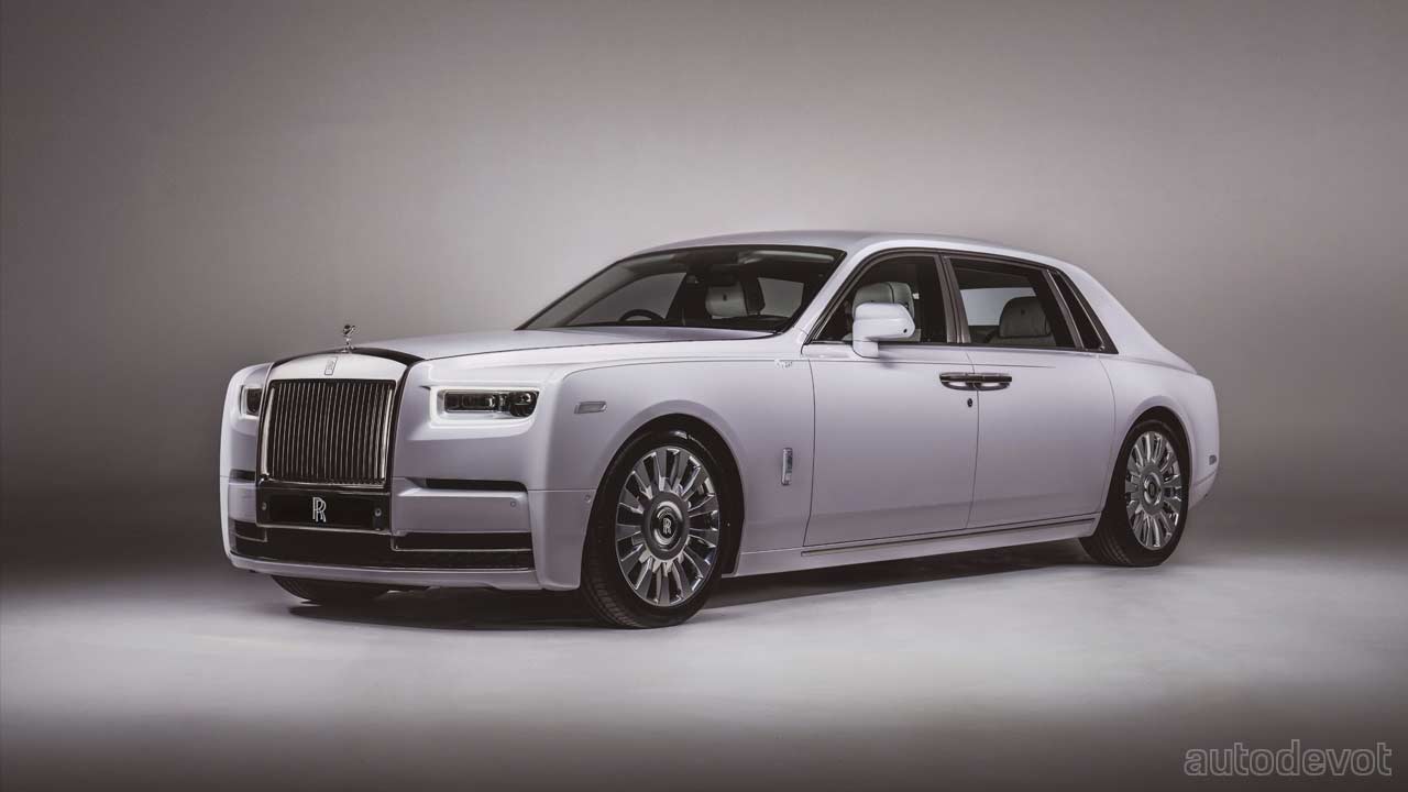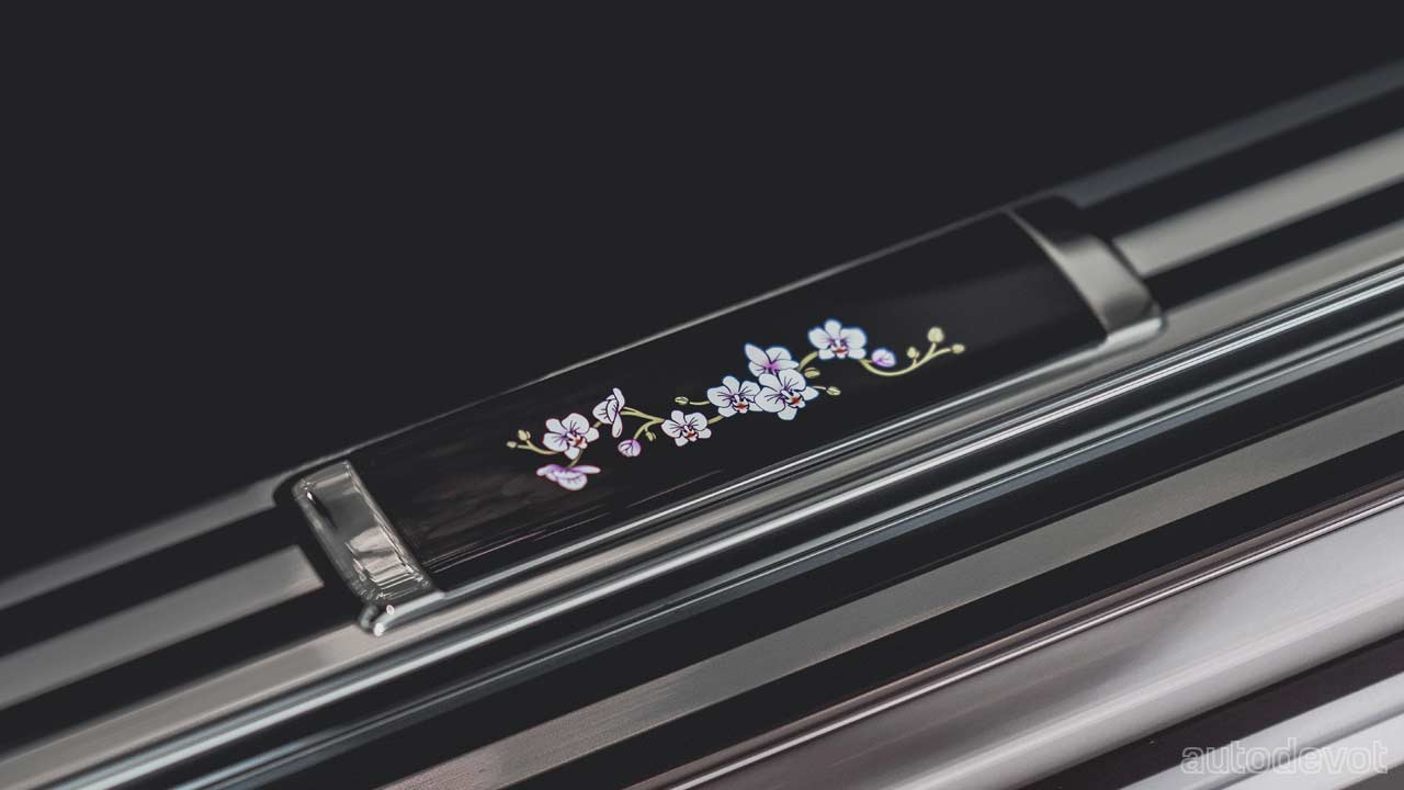 As the name suggests, the Phantom Orchid is all about the orchid flowers; I mean, the artwork. The exterior is finished in Arctic White, but notice that it has a very subtle violet tint—inspired by orchids. Also, the paint has been mixed with fine glass particles through a special process, which makes the car shimmer under a bright light. The coachline on either side of the Phantom incorporates a bespoke, orchid-inspired motif.