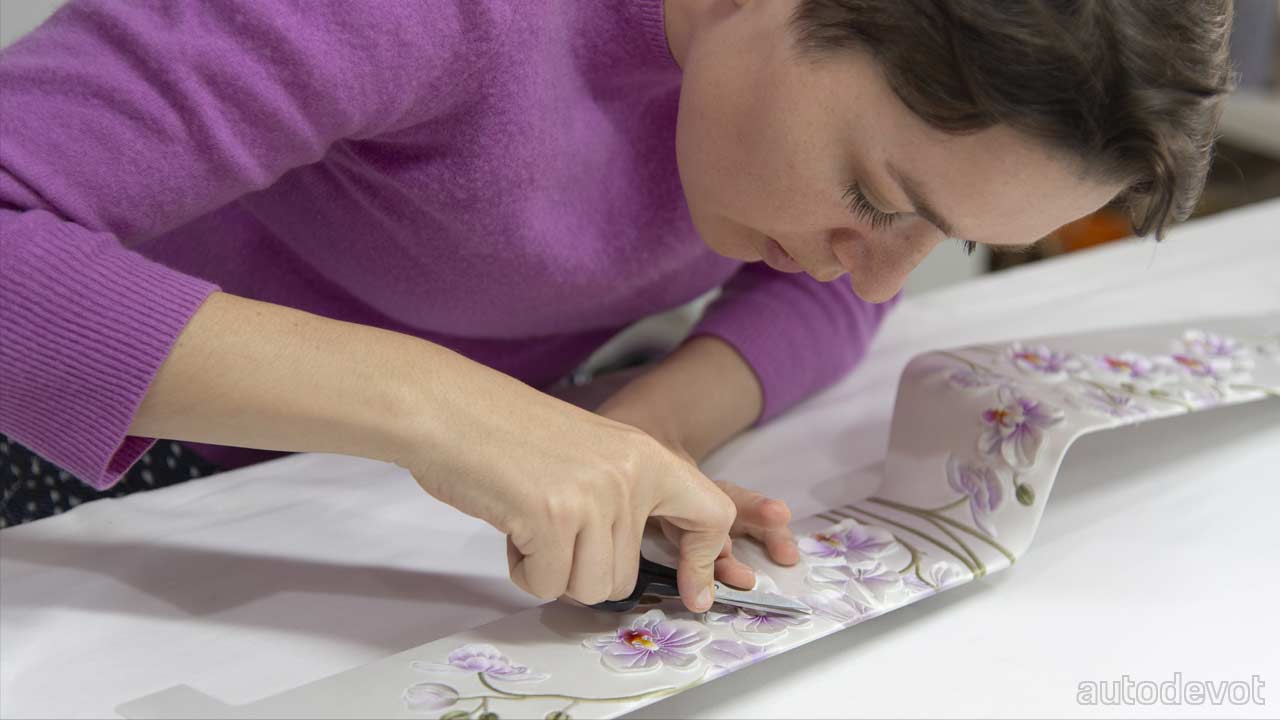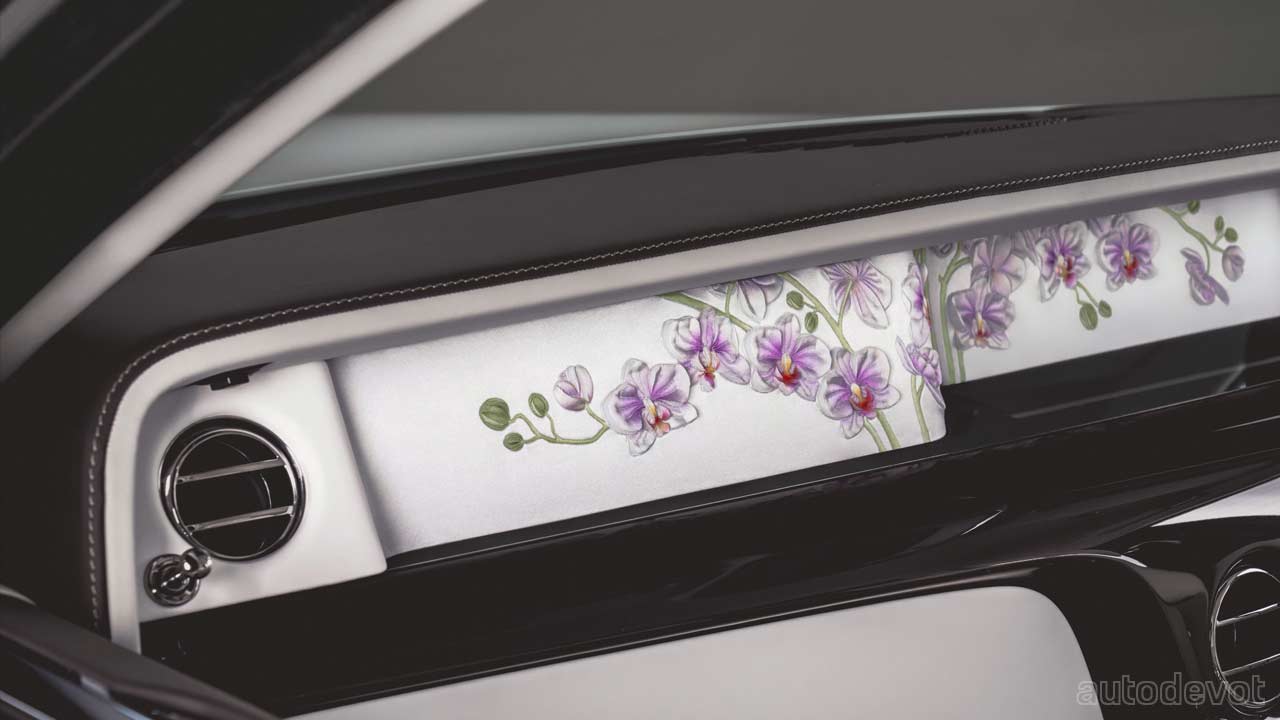 But as with any bespoke Phantoms out there, more of the bespoke elements can be found in the cabin of the Phantom Orchid. The Gallery on the dashboard features a hand-sculpted orchid artwork created by a team of 6 led by Murray, who together spent over 200 hours refining the design. Murray started by illustrating the design by hand before creating a digital version that she could print directly onto the silk crepe satin. The final part of the process involved a meticulous hand-sculpting of the flowers, stacking layers of fabric to create a 3D effect.
