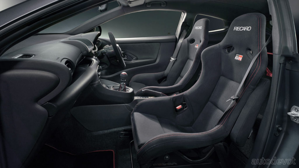 But anyway, the cockpit features Recaro full bucket seats with side airbags, and reinforcement bracing in place of the rear seats. Also, notice that there’s no touchscreen on the dashboard, which I personally, appreciate. What I also appreciate (and many others), is that 6-speed manual shifter. Speaking of which, the manual transmission in the hotter hatch features closer gear ratios and a low final gear for a spicier driving experience. While the regular GR Yaris gets Torsen LSD front & rear, the GRMN Yaris boasts a mechanical LSD front & rear.