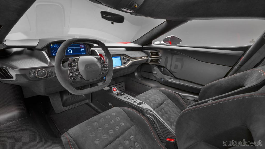 Inside, the carbon fibre seats are wrapped in Ebony Alcantara, complemented with gold and red accent stitching. The Alcantara can also be found on the dashboard, steering wheel, pillars and headliner. The paddle shifters are in Alan Mann red. Also, notice the No. 16 roundel on the door cards.