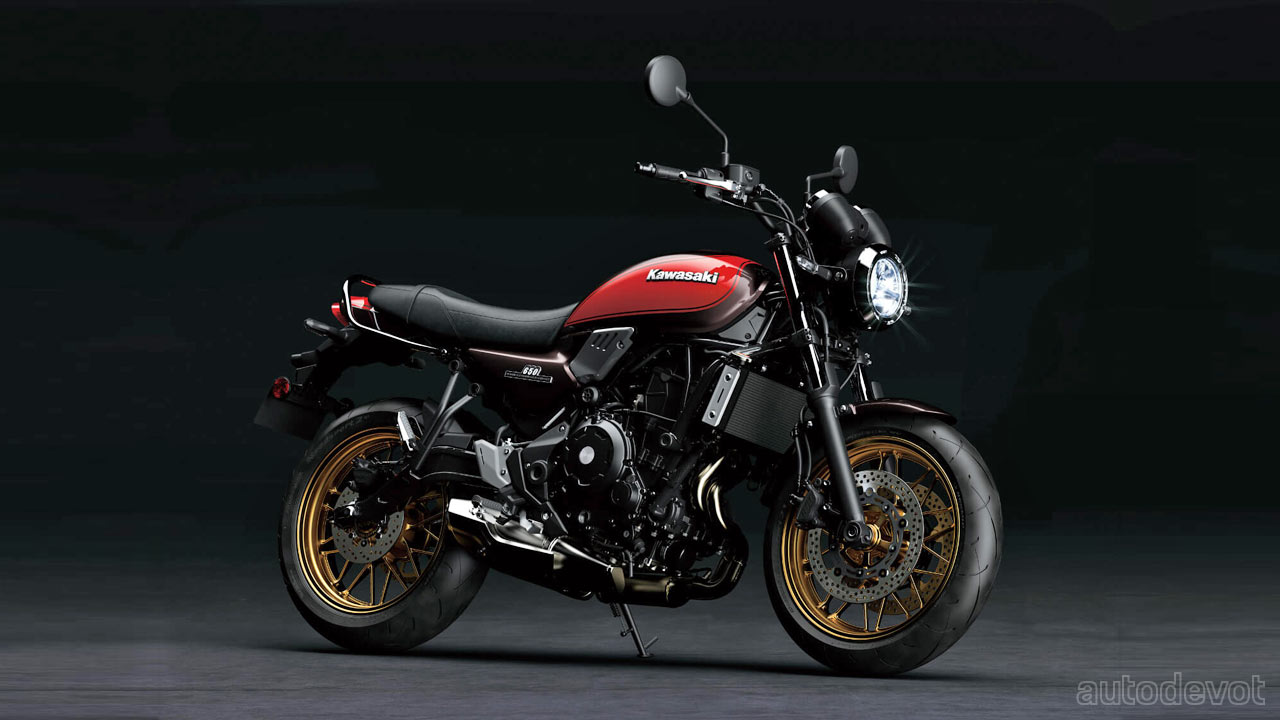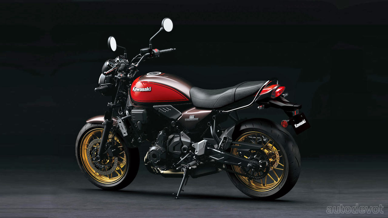 Speaking of which, the body panels are in some kind of a brown, with red application on the fuel tank and near the rear grab handle. The frame is in gloss black, while the 17-inch cast wheels are painted gold. But then the standard Z650RS wheels are also available in gold (with Candy Emerald Green). Also, the seat leather is said to have a different texture compared with the standard model. Rounding off the special edition is a commemorative Z 50th logo on the fuel tank.