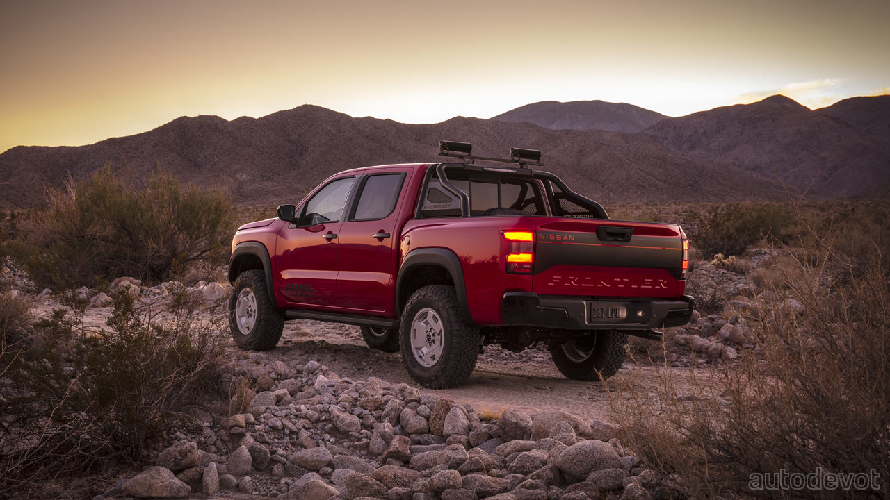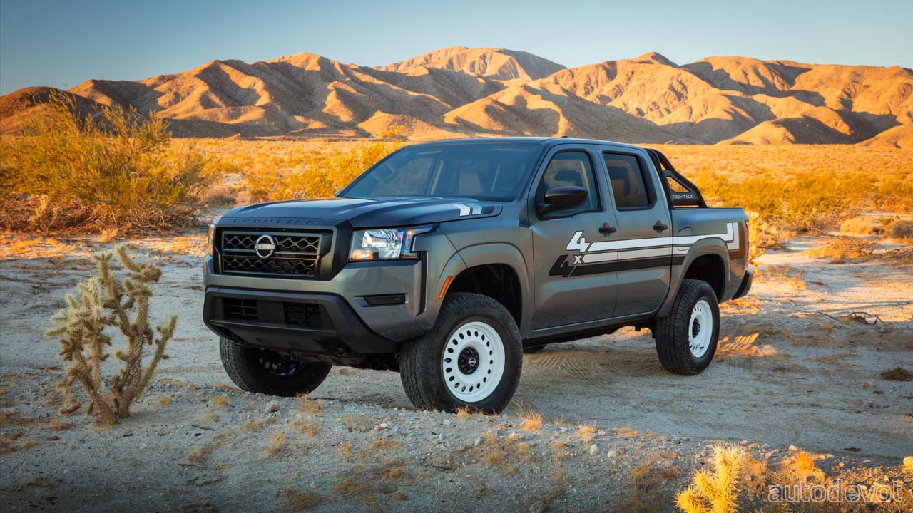 For the 2022 iteration, the design team used gray exterior tones and decals for apparently a sense of modern, cool attitude. But I think the white-painted steel wheels are the only ones that truly match the aforementioned classic truck; the wheels are actually 2022 Frontier spare wheels shod with PRO-4X tires. Other key modifications include a 2.5-inch lift kit with adjustable front upper suspension arms and a sport bar behind the cab.