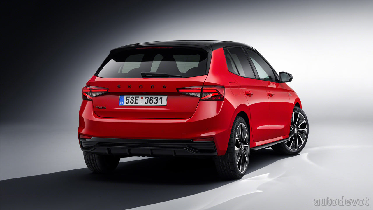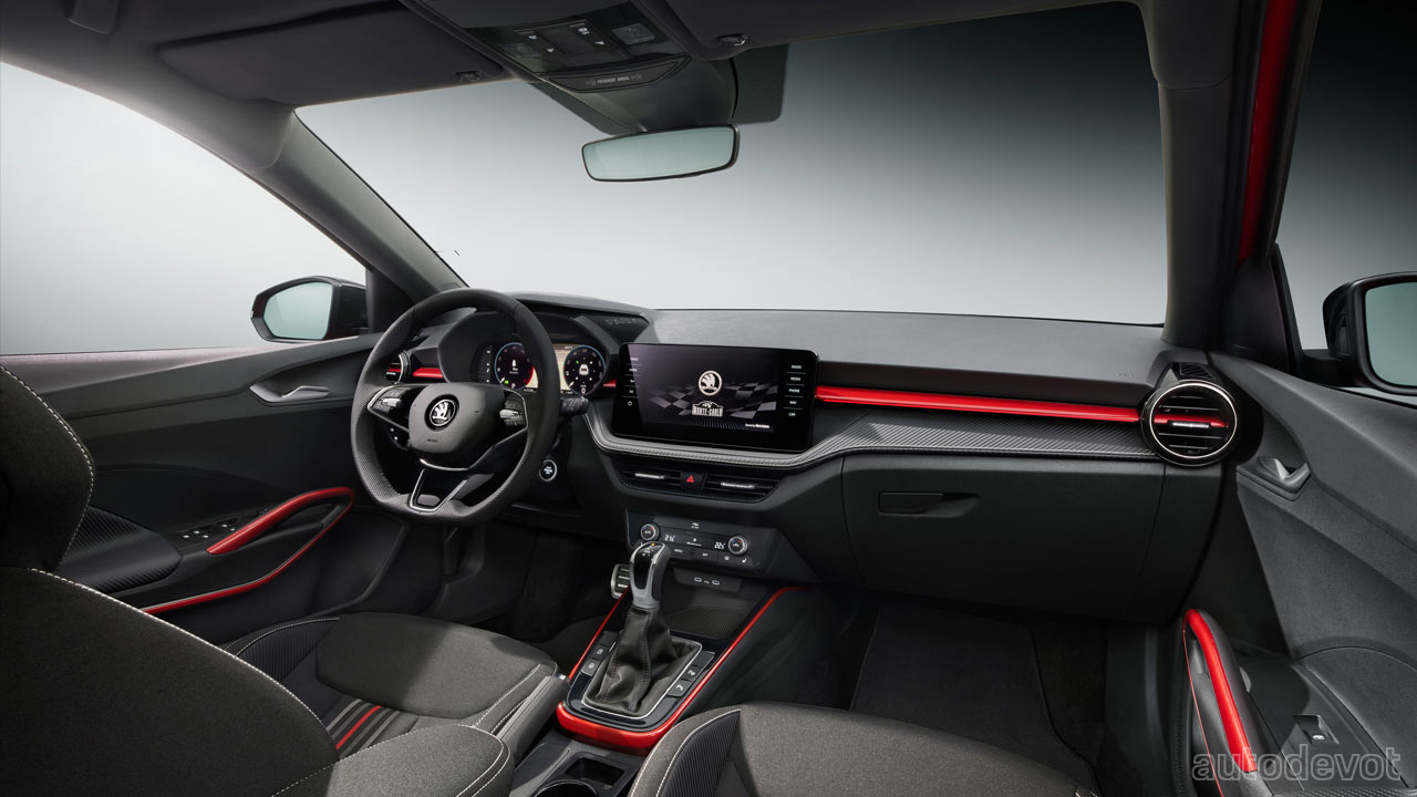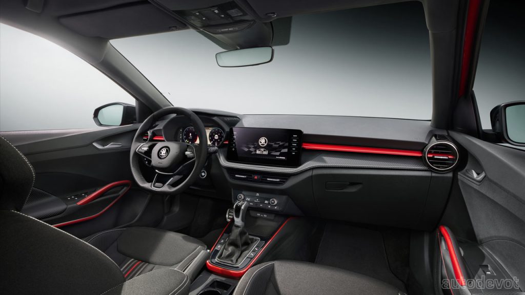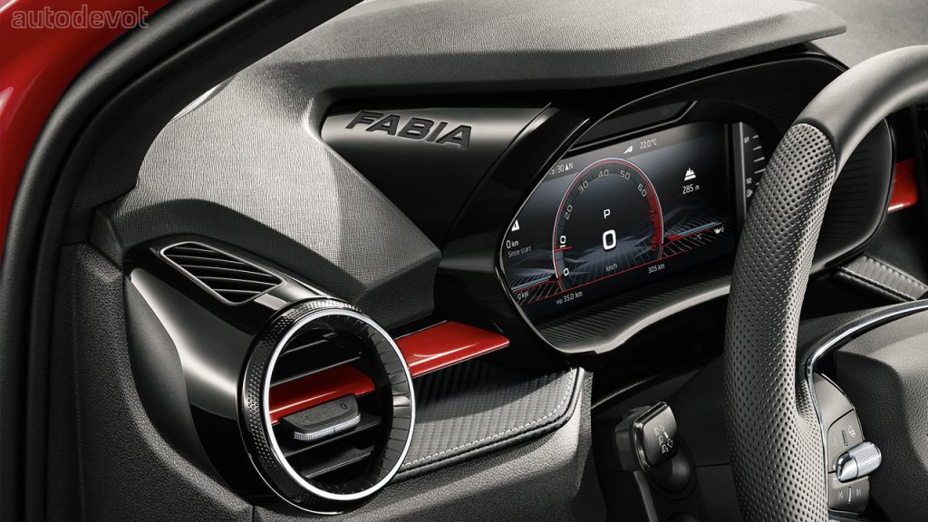 On the exterior, the Fabia Monte Carlo features contrasting black elements such as the grille, the mirror caps, the window frame on the side, badges on the tailgate, and a diffuser-like insert on the rear bumper. With the optional dual-tone paint scheme, the A-pillars will also come in black, which otherwise would be in body color. Speaking of colors, red is not the only one on offer; there are other colors too, such as white, silver, orange, blue, gray and black. The car comes with exclusive 16-inch ‘Proxima’ alloy wheels, while there are optional 17-inch ‘Procyon’ alloy wheels with aero inserts in black and 18-inch ‘Libra’ alloy wheels. A little ‘Monte Carlo’ badge on the front fender rounds off the exterior looks.