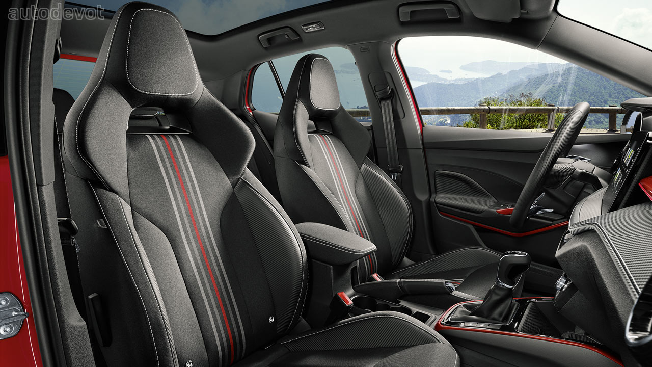 The dark-themed cabin of the Fabia Monte Carlo looks just as spicy as the exterior, with red accents on the dashboard, doors and on the centre console as well. Not entirely sure if this accent color is exterior body color-dependent or remains red regardless of the exterior body color. But anyway, there’s a flat-bottom steering wheel—which is always a welcome feature, and also a carbon fibre-like (fake) pattern on the dashboard and sports seats—which might not be up to everyone’s tastes, but looks good nonetheless. Adding more to the drama are the stainless steel pedal covers. As you might expect, the rest of the features have been carried over from the regular model.