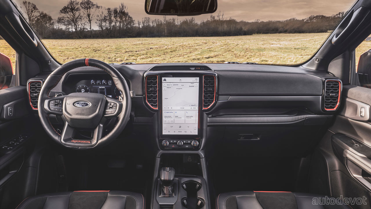Inside, the new Ranger Raptor gets a 12.4-inch digital cluster, a 12-inch SYNC 4A centre touchscreen, wireless Android Auto & Apple CarPlay connectivity, Bang & Olufsen audio system, Code Orange accents, and jet fighter-inspired sports seats. But that’s not what we are really interested to know, is it?