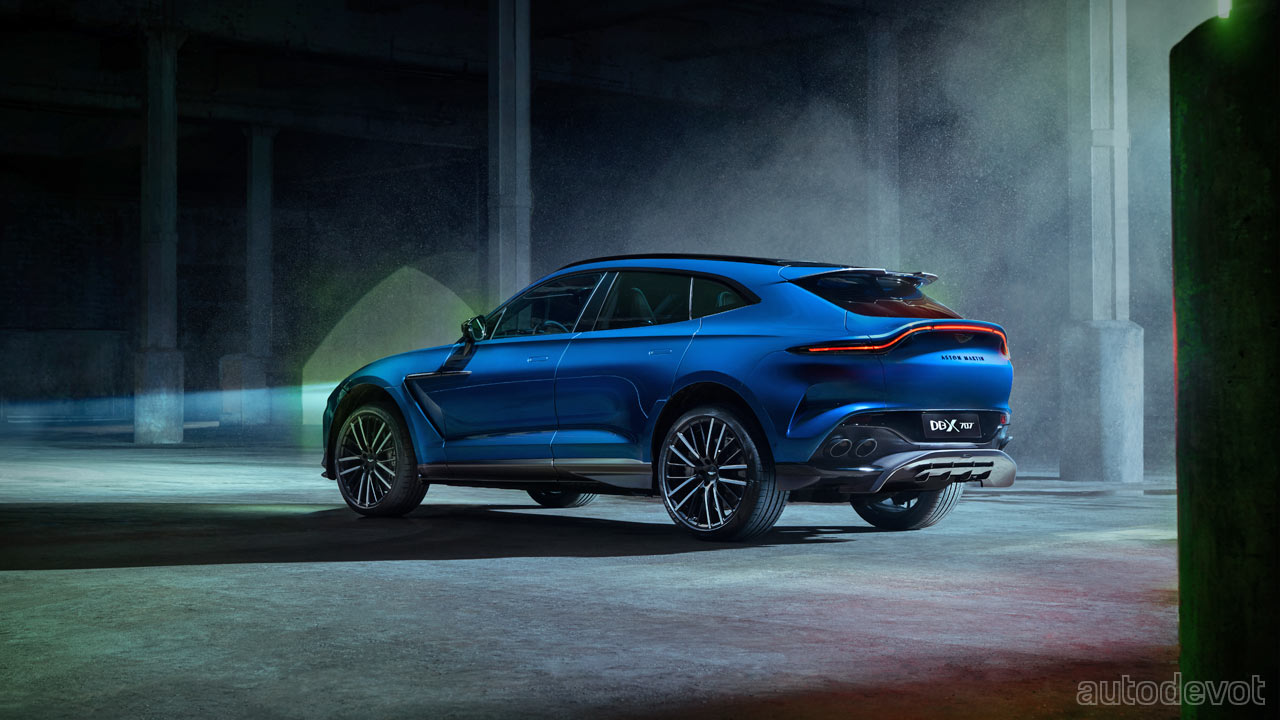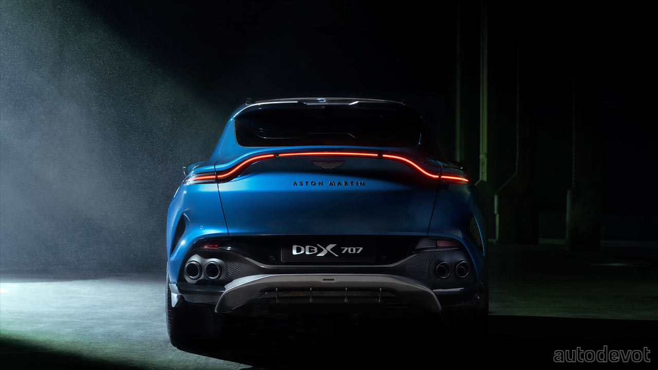 But anyway, let’s talk a little bit about the DBX707 which is not a limited edition product in any way. Since Aston Martin tasted a bit of sales success with the DBX, the folks probably decided to offer a more powerful version. Most of the visual changes that you see serve a purpose; the front openings are now larger to feed more air into the engine bay. At the rear, the roof spoiler has carbon fibre extensions, but the significant differences you’ll find on the bumper, where you’ll see quad circular tailpipes and a gigantic, multi-level diffuser. Notice that the extended diffuser sort of mimics the upswept tailgate.