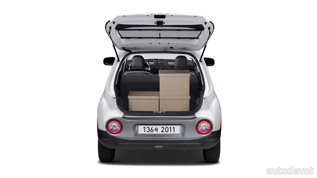 Speaking of which, on the exterior, it is already a stripped-down version with black steel wheels, body-colored A-pillars, and lack of roof spoiler and roof rails. However, there’s a KRW 950,000 optional Turbo exterior package (available on 1.0L turbo model) that gets you sporty-looking front & rear bumpers. Inside, the rear seats have been deleted to free up 940 litres of cargo space. As you can see, there’s a partition between the front & rear section, and also metal bracings for the rear windscreen and rear side windows.