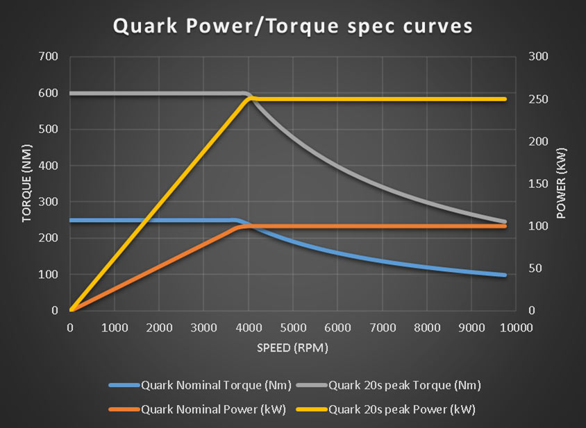 The Quark is unique in its high efficiency in combination with its class-leading torque-to-power-to-rpm-to-weight matrix. This means, when using the Quark in applications such as marine, aircraft or VTOL, there is no need for a step-down transmission, instead a direct drive can be achieved, as the rpm of the motor is right from the get-go. Small high-revving motors can have a higher peak power-to-weight ratio, but they need transmissions in most applications in order to get to the desired output rpm and torque, causing energy loss and adding weight and complexity to do the same job. So any benefit in size is lost. In other cases, like the Terrier application, the transmissions can be reduced in size and complexity compared with higher-revving, less torque dense motors, which is also a big win. I guess we’re trying to reach the edge of optimal in-betweeness.
