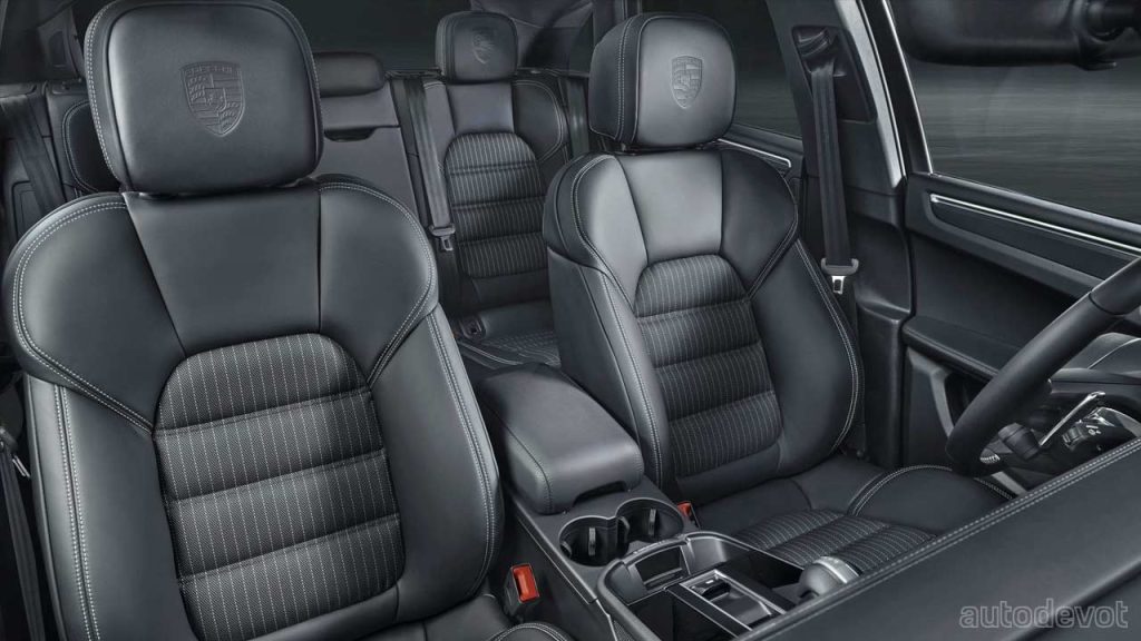 The dark-themed cabin features standard 8-way electrically adjustable heated sports seats with model-exclusive upholstery; a multifunction GT heated sports steering wheel; a Sport Chrono stopwatch on the dashboard, and a 10.9-inch central touchscreen with navigation. Optional features include a multifunction GT sports steering wheel in Race-Tex with carbon trims and an ionizer.