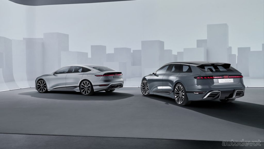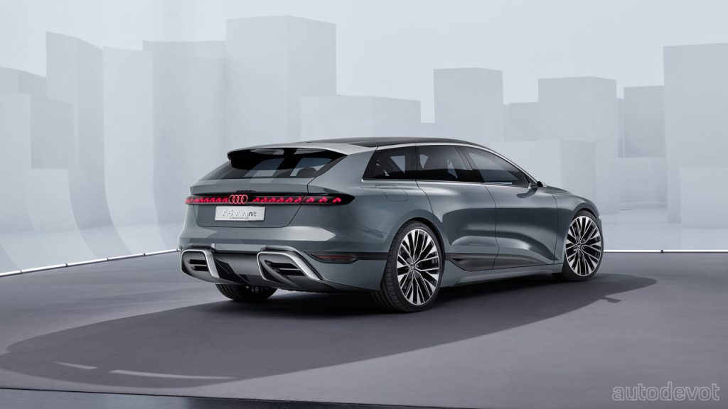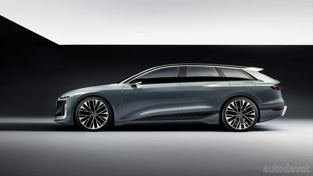 Speaking of which, the A6 Avant e-tron is gonna be the second model to be built around the new Premium Platform Electric (PPE)—which was jointly developed with Porsche. The front half of the vehicle looks pretty similar to its sedan sibling, but obviously, the Avant is all about that rear half—which in the A6 Avant e-tron concept looks pretty heavy. Audi didn’t share the wheelbase information, but I guess the side profile gives us a pretty good idea of what to expect. But otherwise, it has got the same LWH dimensions and the same lighting technology as the sedan. It also boasts a drag coefficient of 0.24 Cd, just 0.02 units above that of the sedan. The 22-inch wheels, however, have a different design.