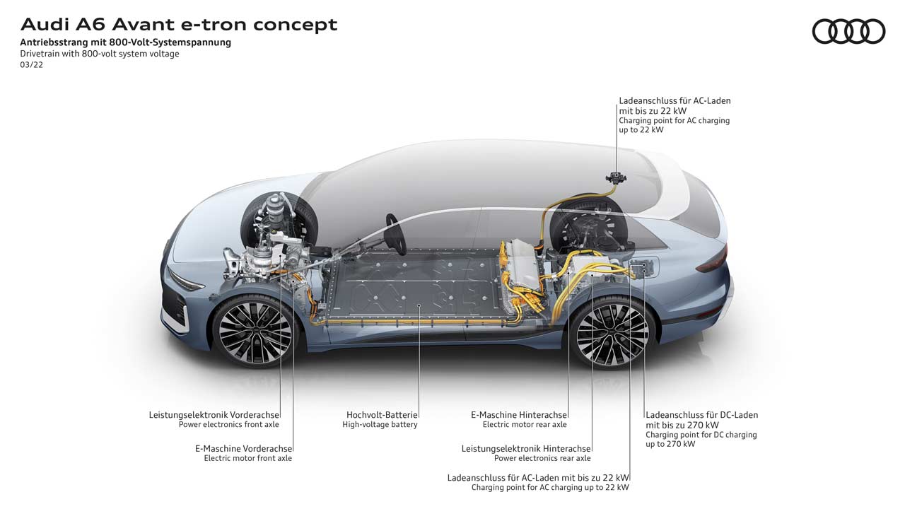Obviously, the rest of the things are the same as well. There are two electric motors offering combined output figures of 350 kW (476 metric hp) and 800 Nm (590 lb-ft). A 100 kWh battery pack is claimed to offer a range of over 700 km (435 mi), depending on the variant. Thanks to 800-volt architecture, the battery pack can be DC fast-charged with up to 270 kW. Audi claims that a 10-minute fast-charge can deliver more than 300 km (186 mi) range.