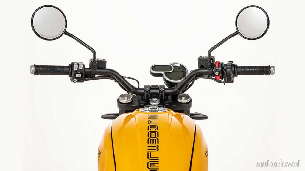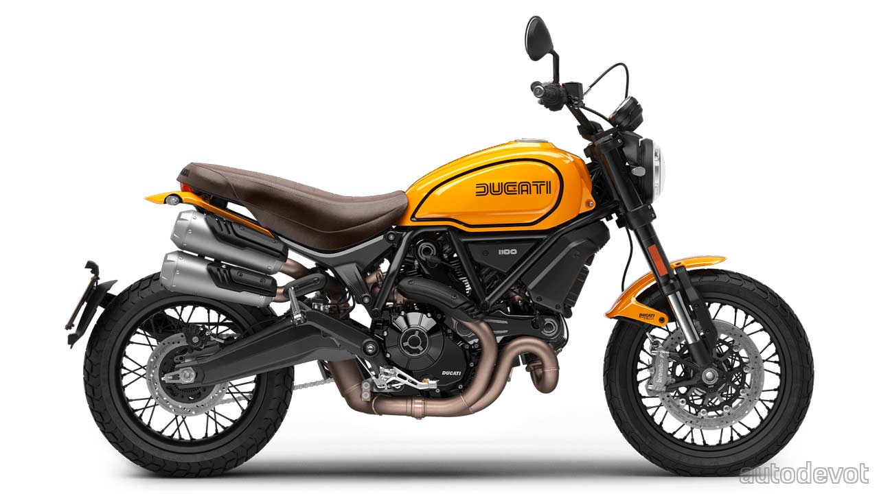 The Scrambler Tribute 1100 Pro is finished in a head-turning Giallo Ocra livery, which was used on the twin-cylinder 450 Desmo Mono and 750 Sport of 1972. Complementing the paint finish is a ’70s Ducati logo designed by Giugiaro. Black spoked wheels (18-inch at the front and 17-inch at the rear) and circular rear-view mirrors are some of the other highlights.