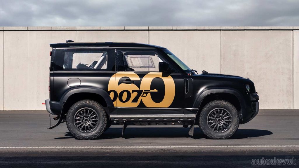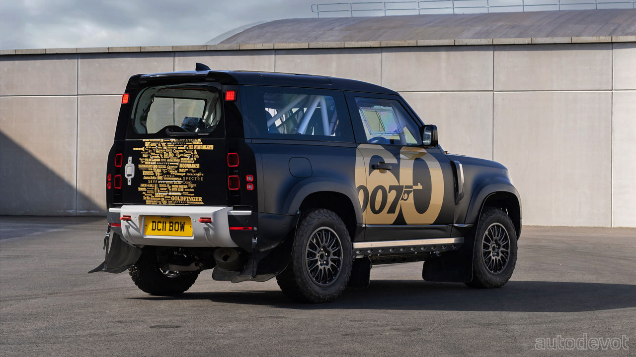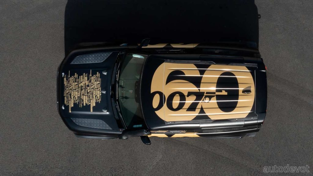 The black-painted one-off Defender is contrasted with a rather large 007 60th logo on the roof and sides. The tailgate and the hood feature the names of all the Bond movies, again, in gold.