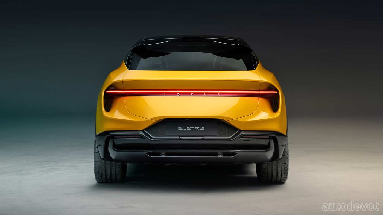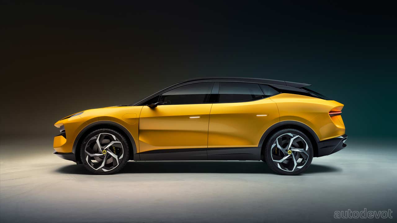 Moving on to the juicy bits of the story then, the Eletre packs two electric motors, one at each axle. A three-in-one electric drive system integrates each motor with a controller and reducer. The power output is gonna be 447 kW (608 metric hp/600 bhp), but the torque is a secret at the moment. The 100 kWh battery pack is targeted to deliver a range of around 600 km (373 mi) on a single charge. And thanks to 800-volt architecture, the battery pack can be DC fast-charged with up to 350 kW; a 20 min charging is said to deliver 400 km (248.5 mi) of range.