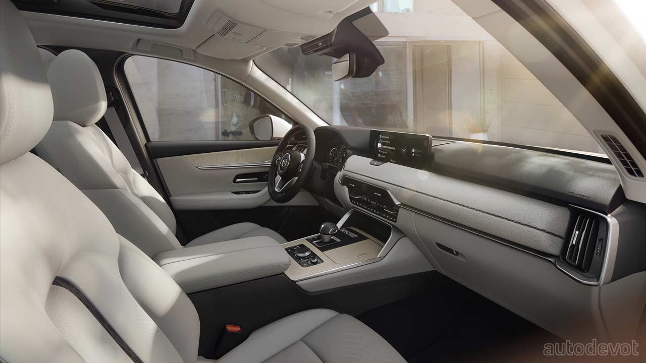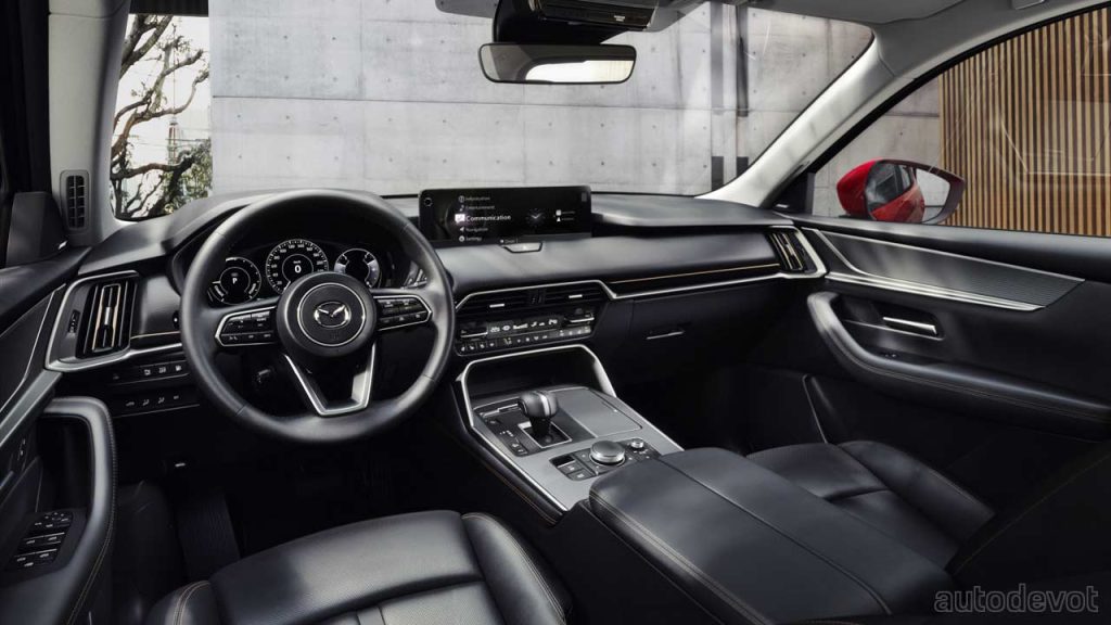 Alright then. The PHEV powertrain combines a 2.5-litre 4-cylinder petrol engine and an electric motor integrated with a new 8-speed automatic transmission. The ICE produces 141 kW (192 metric hp) and 261 Nm (192.5 lb-ft) of torque, while the e-motor offers 100 kW (136 metric hp) and 250 Nm (184 lb-ft) of torque. The combined figures are gonna be 241 kW (328 metric hp) and 500 Nm (369 lb-ft). The output is channeled to all four wheels via Mazda’s i-Activ AWD system.