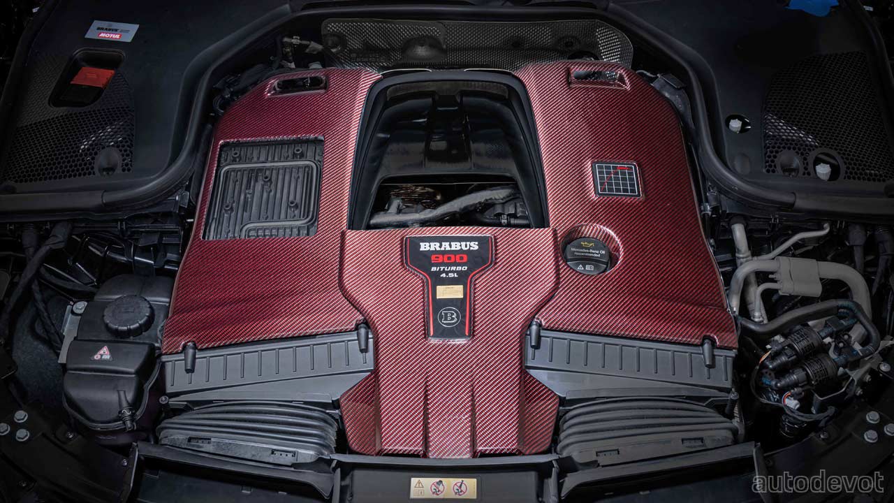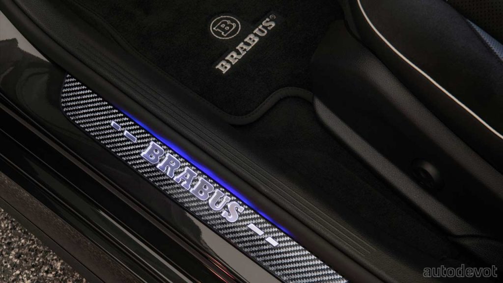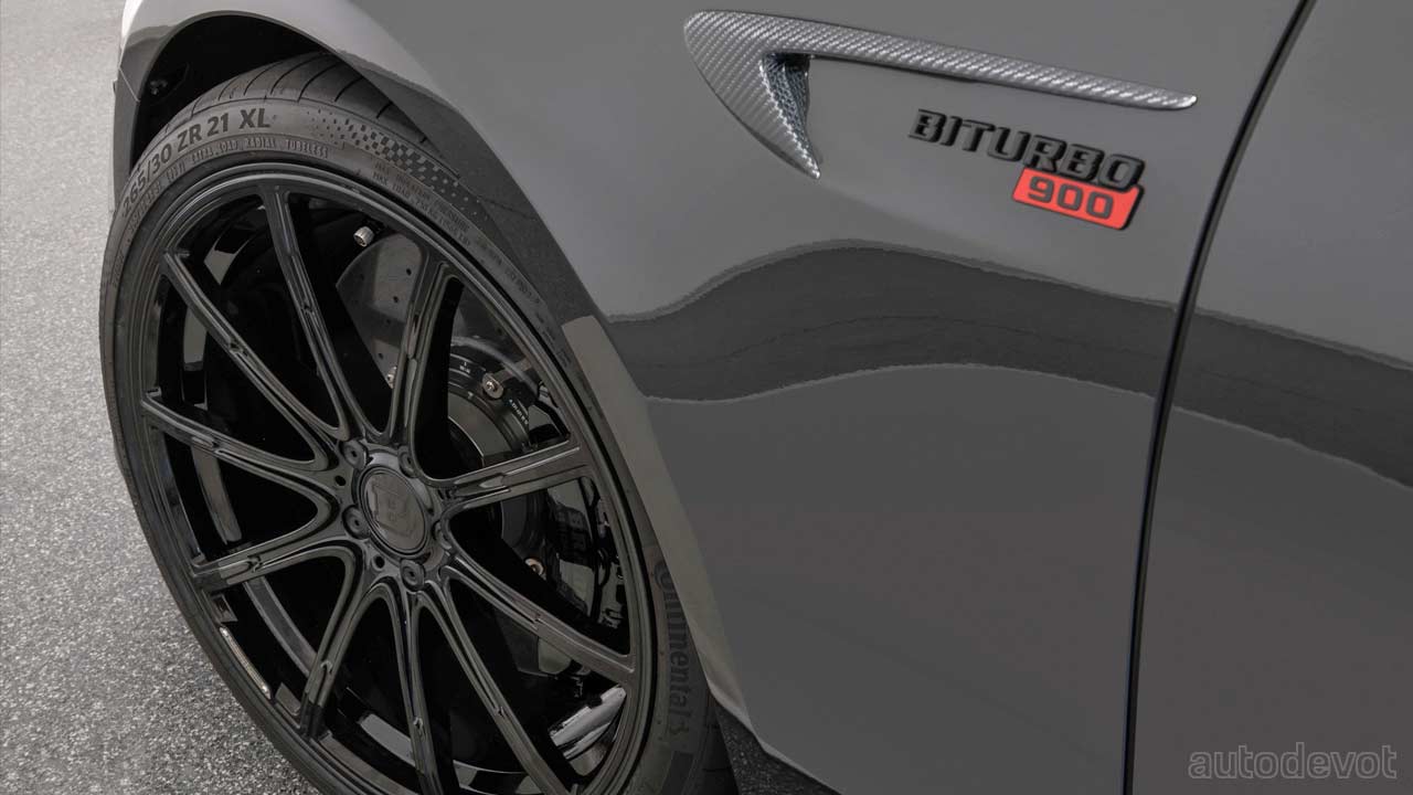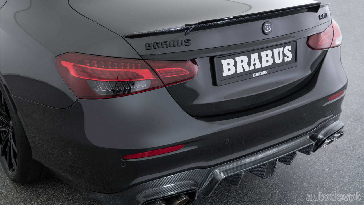 And so, the transformation of the AMG E 63 S to Brabus 900 starts with the carbon fibre body kit, of course, which includes the grille inserts, the bumper intake inserts, a lip spoiler, a rear boot lid spoiler, and a more aggressive rear diffuser as well. That not-so-subtle boot lid spoiler is claimed to generate additional rear-axle downforce at high speeds. Carbon titanium exhaust tips and 21-inch Brabus Monoblock forged wheels round off the looks. Adding to the drama is a Brabus suspension module for the standard air suspension, lowering the ride height by about 20 mm (0.8-inch).