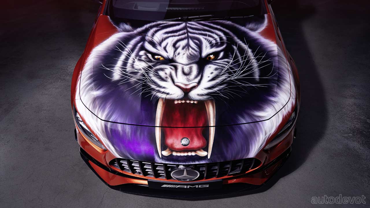 Dubbed as “Tiger London”, the multicolor paintwork, the large head of a white tiger on the bonnet and the large AMG emblem on the sides of the car apparently pay homage to the vibrant and diverse custom car scene in the UK in the 1960s, 1970s and 1980s.