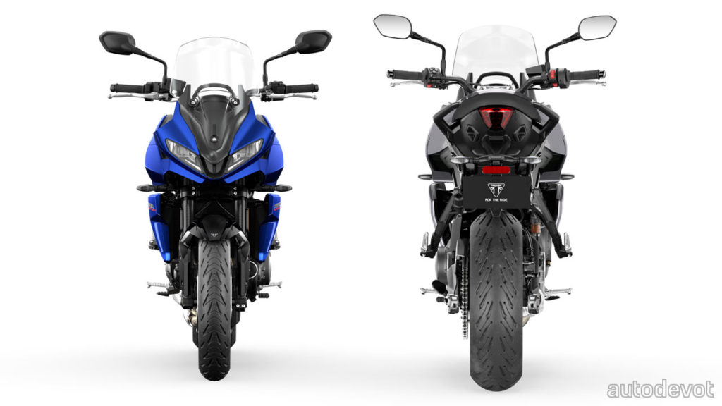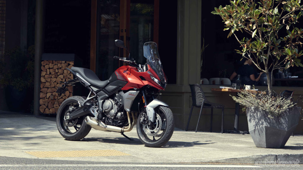 The 660 cc in-line 3-cylinder liquid-cooled engine develops a maximum of 60 kW (81 metric hp) at 10,250 rpm and 64 Nm (47 lb-ft) of torque at 6,250 rpm, the same figures as in the Trident 660. The engine is paired with a 6-speed gearbox. With fluids, the motorcycle weighs 206 kg (454 lbs), which is 17 kg (37.5 lbs) more than its naked sibling.