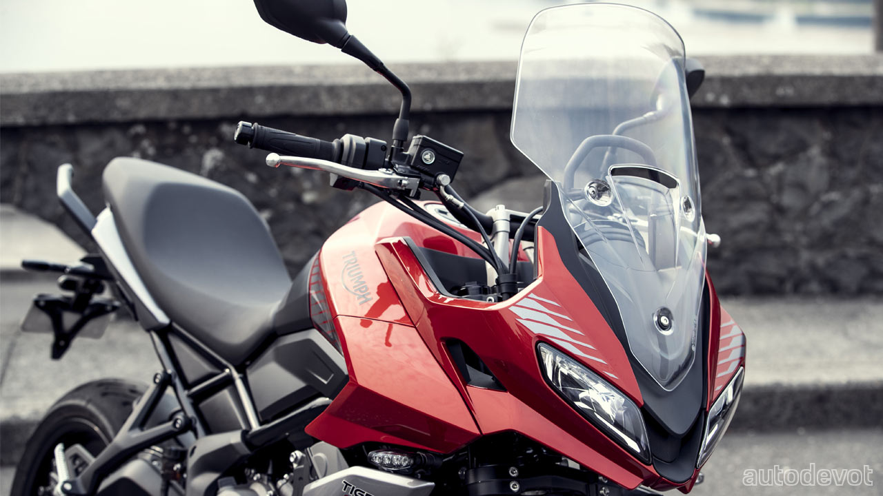 The Tiger Sport 660 is essentially an adventure version of the Trident 660. The windscreen is height-adjustable, of course. Other features include LED headlights, self-canceling turn signals, a color TFT display, Road and Rain modes, switchable traction control, ABS, and slip and assist clutch.