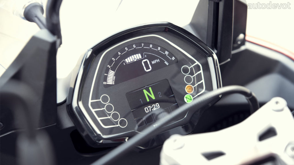 Braking duties are handled by twin 310 mm discs at the front gripped by Nissin two-piston sliding calipers, and a single 255 mm disc at the rear gripped by Nissin single-piston sliding caliper. Front suspension is a Showa 41 mm upside down fork with 150 mm travel, while at the rear, there’s a Showa monoshock with hydraulic preload adjustment and 150 mm travel.