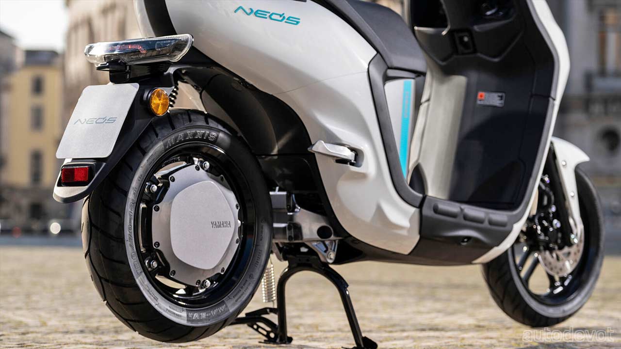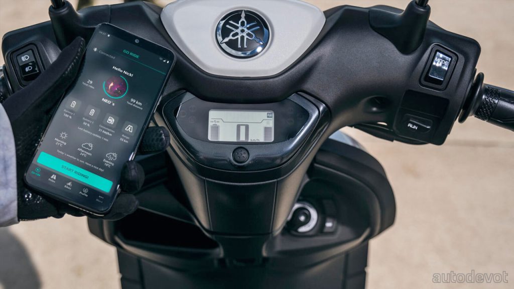 The new NEO’s is powered by a brushless electric motor at the wheel hub that offers a power output of 2.06 kW (2.8 metric hp) at 40 km/h (25 mph) in STD mode and 1.58 kW (2.1 metric hp) at 30 km/h (19 mph) in ECO mode. However, the power output is reduced across the entire speed range to extend battery life for a range of approximately 38.5 km (24 mi) on a full charge. The optional second battery can extend the range to approximately 68 km (42.2 mi), Yamaha said. The scooter comes with a special connector for that. The battery pack is claimed to take approximately 8 hours to get fully juiced up.