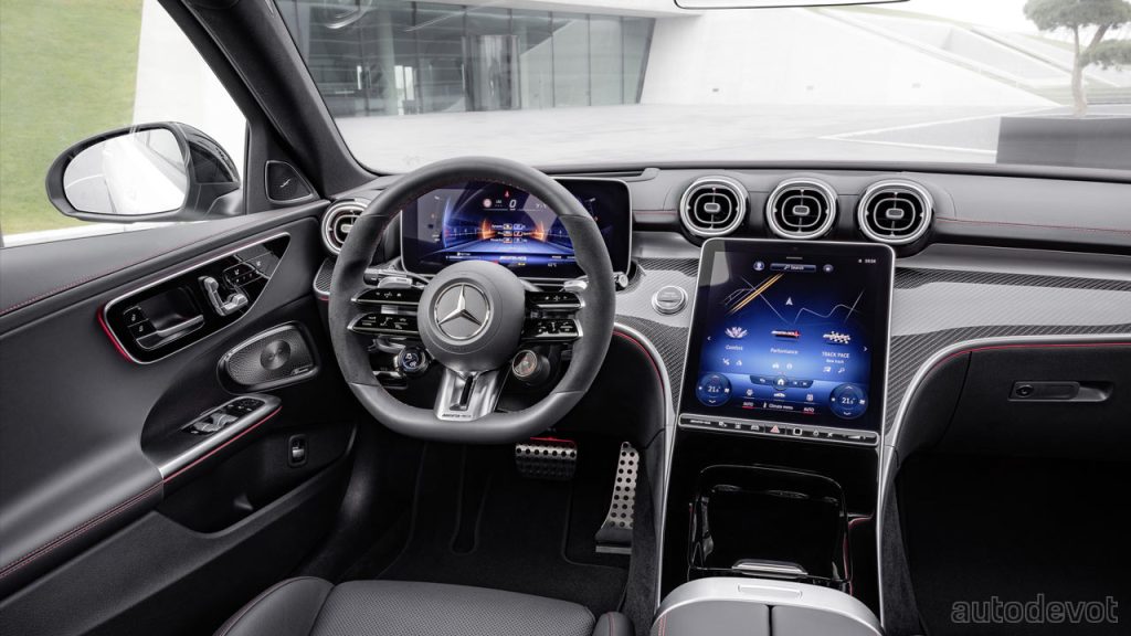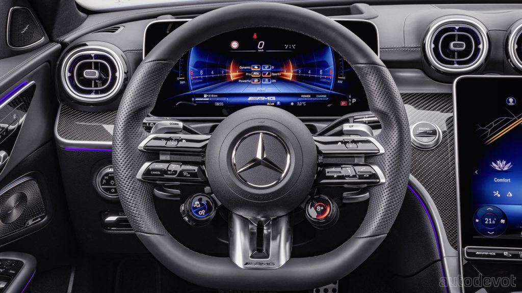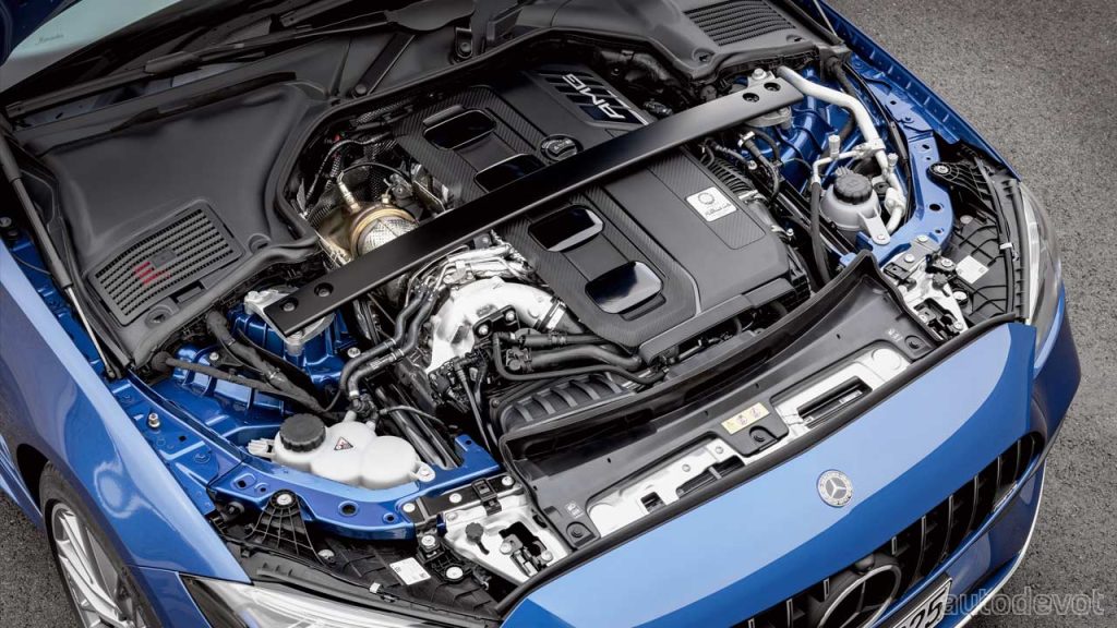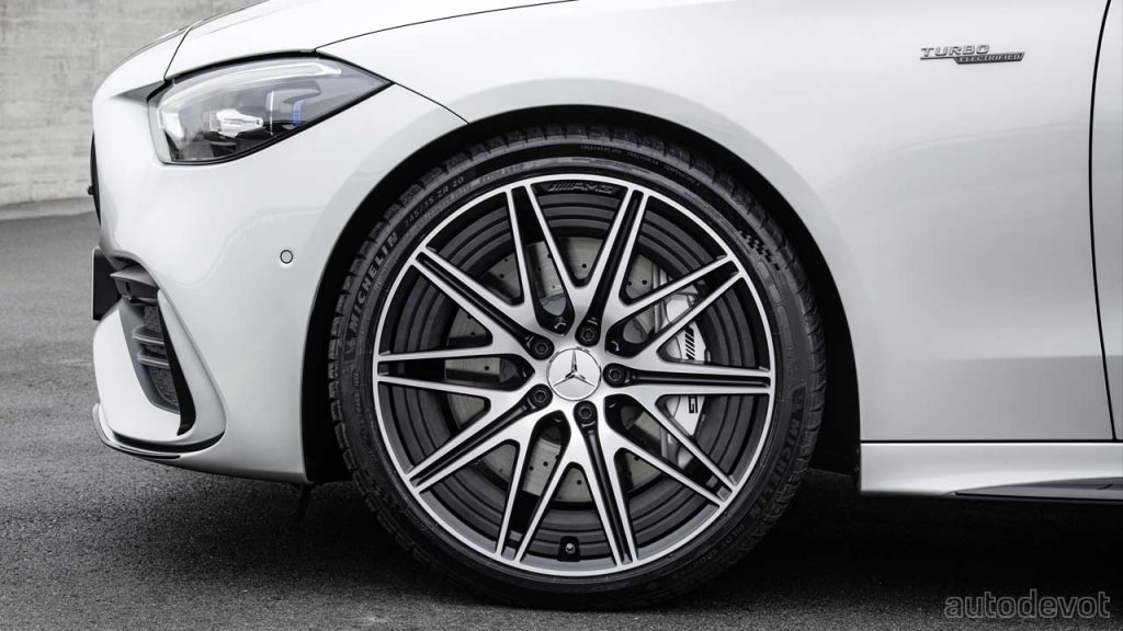 Moving on to the business end of the story, the new AMG C43 is powered by a 2.0-litre 4-cylinder turbocharged petrol engine (M139) combined with a 48-volt mild-hybrid system that offers a 10 kW (14 metric hp) temporary power boost depending on the situation. The ICE pumps out 300 kW (408 metric hp) at 6750 rpm and 500 Nm (369 lb-ft) of torque at 5000 rpm. Compared with the previous-gen C 43, there are 18 horses more while the torque is down by 20 Nm.