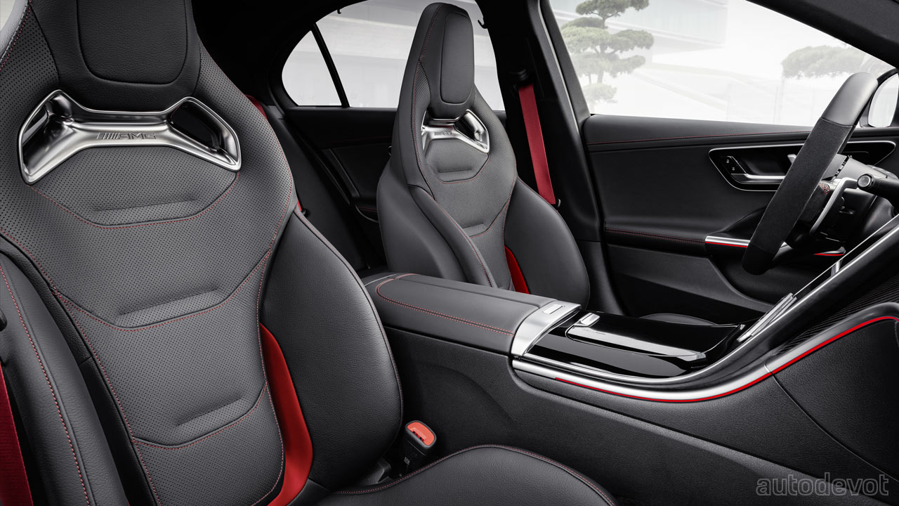 Inside, you’ll find AMG seats upholstered in a combination of Artico man-made leather and Microcut microfibre with red contrasting stitching; AMG Performance flat-bottom steering wheel in Nappa leather, and AMG-specific graphics and displays in the MBUX infotainment system. The AMG Track Pace data logger is also integrated, which records more than 80 vehicle-specific data such as speed, acceleration, steering angle and brake pedal actuation 10 times per second while the car is being driven around a race track.