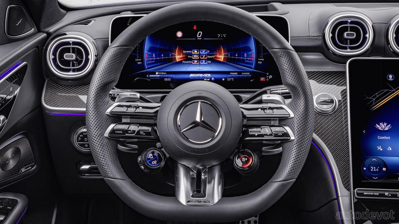 You also get AMG sports braking system with discs measuring 370 x 36 mm at the front gripped by 4-piston fixed calipers and 320 x 24 mm at the rear gripped by single-piston calipers; AMG Ride Control suspension with Adaptive Damping System; rear-axle steering, and AMG exhaust system with changing noise level depending on the drive mode.