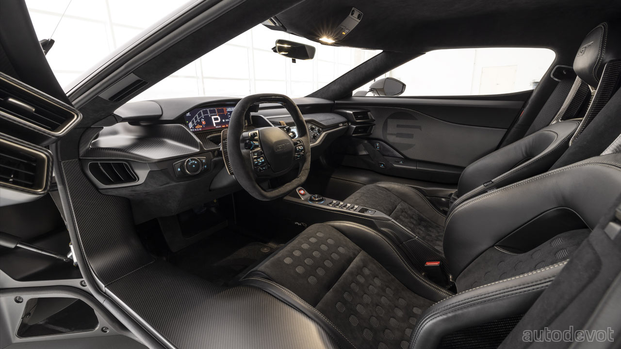 Inside, the carbon fibre seat surfaces are wrapped in Ebony Alcantara, contrasted with gold accent stitching, while embossed seating surfaces and head restraints carry a debossed GT logo. The dashboard is wrapped in Ebony leather and Ebony Alcantara, while pillars and headliner are wrapped exclusively in Ebony Alcantara.