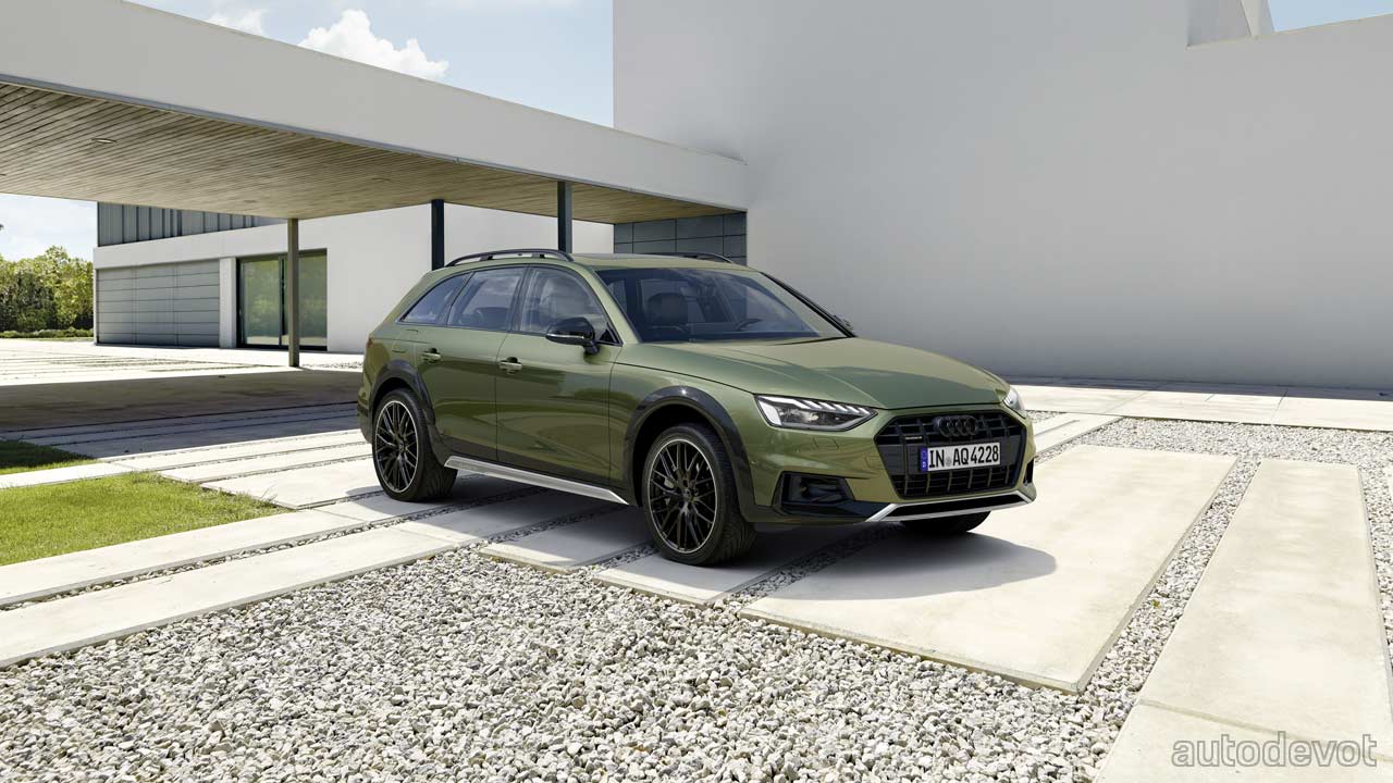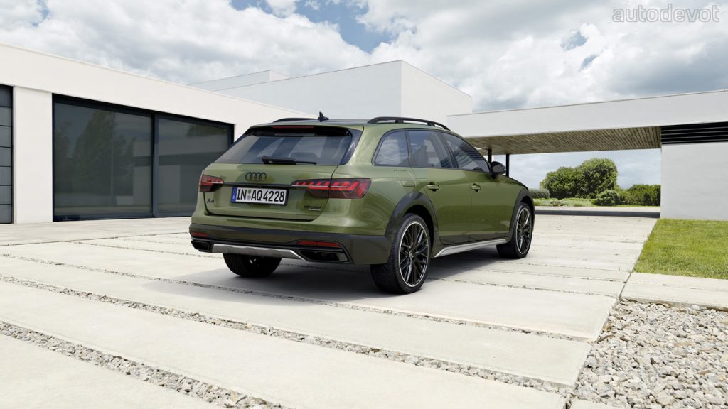The A4 allroad quattro wagon is getting a new optional package for 2023. The €775 Black Optics Pro Package gets you windshield frame, exterior mirrors, tailpipes, grille elements, front air intake accents, rear bumper insert, and a connecting line between the taillights in gloss black. Also, notice that the rings are in black as well, as are the badges. Audi also offers the roof rails in black. Plus, new metallic finish color options join the palette: Chronos Gray and District Green.