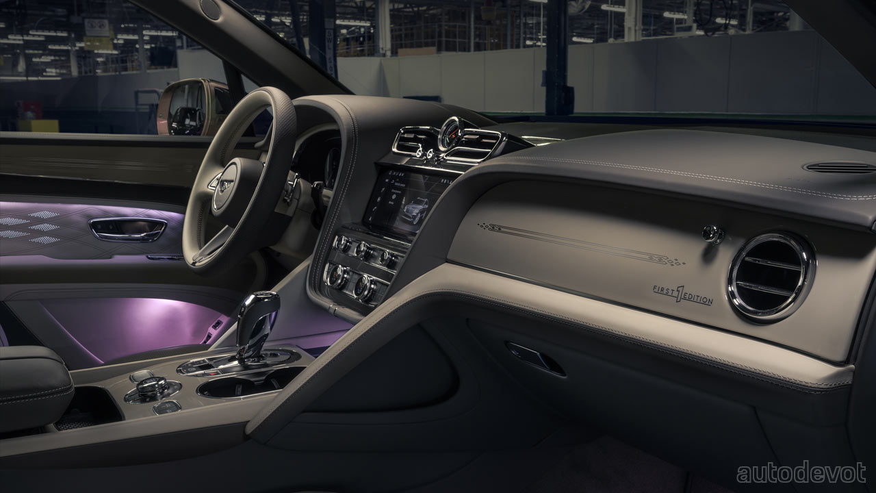 Inside, the First Edition includes Bentley Diamond Illumination and 20-speaker Naim audio system. Notice the First Edition branding on the dashboard and seat backrests.
