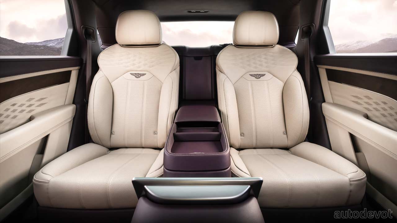 But as you know, the Bentayga EWB is more about that extended rear-seat comfort. Speaking of which, the optional Bentley Airline Seat specification offers 22-ways of adjustment and what is billed as the world’s first auto climate sensing system and postural adjustment technology. In Relax mode, the seat can recline to 40 degrees, while the front passenger seat moves forward and a leather-lined footrest deploys from the back of the front passenger seat.