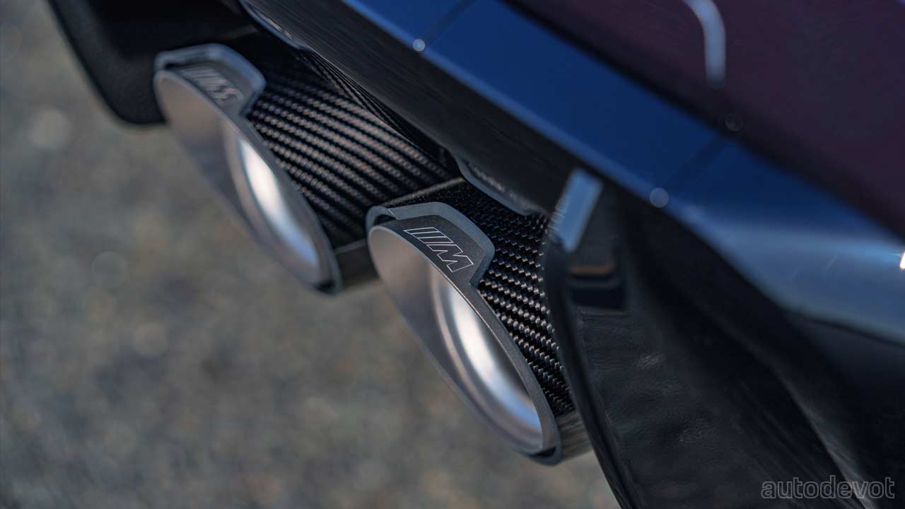 And regardless of the exterior paint choice, each M3 Edition 50 Jahre BMW M comes with forged wheels (19-inch at the front and 20-inch at the rear) in matte Orbit Grey finish. Behind the wheels, the calipers of the standard M Compound brakes can be painted in red, blue or black. Buyers can opt for M Carbon Ceramic brakes with gold calipers. Further exterior enhancements from the M Performance catalog are also part of the package; these include a carbon fiber front splitter, a bootlid carbon fiber spoiler, and quad tailpipes with carbon fiber and titanium finishers. And of course, a carbon fiber roof comes standard as well. Also, notice that the standard BMW roundels are replaced with retro-ish BMW Motorsport logos.