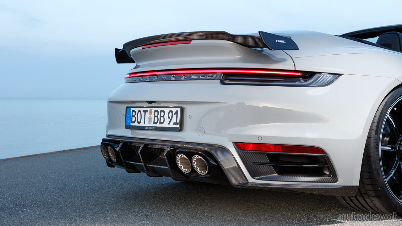 Moving on to the juicy bits of the story, the 3.8-litre twin-turbo flat-six motor has been paired with Brabus PowerXtra P38S-720 performance upgrade, which pumps out 51.5 kW (70 metric hp) and 100 Nm (74 lb-ft) extra, bringing the total to 529.5 kW (720 metric hp) and 900 Nm (664 lb-ft). Brabus claims a 0-100 km/h (62 mph) sprint time of 2.6 seconds, while the top speed is limited to 335 km/h (208 mph).