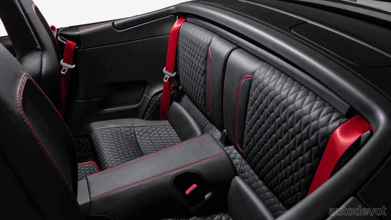 Inside, there’s generous red elements wherever you look, including on the steering wheel, dashboard, door pulls, chronograph, centre console, pedals..you name it. The centre console features gloss carbon inlays. The seats feature diamond quilting combined with red piping and stitching.