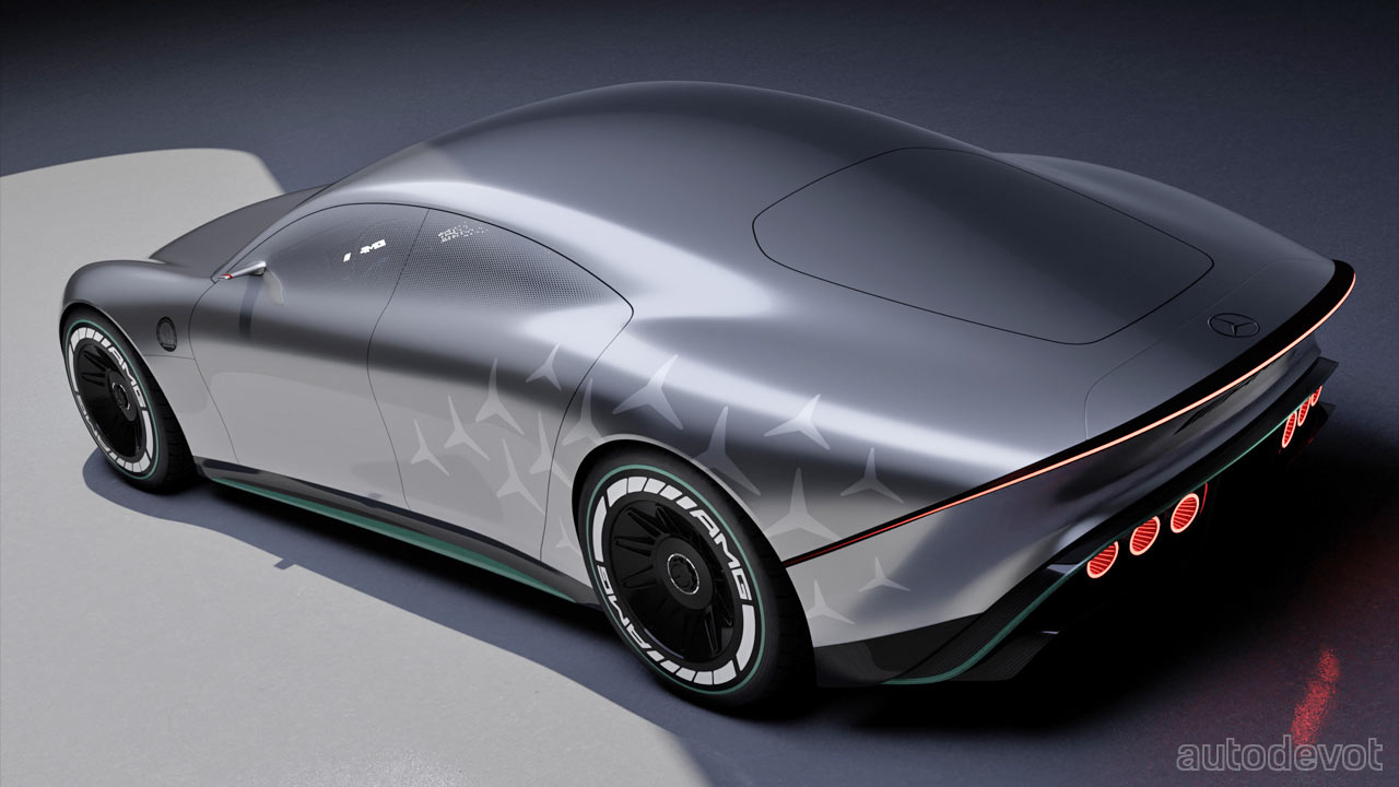 And the three-pointed star on the bonnet is just a graphic, reminding us of the AMG ONE. BTW, what happened to the AMG ONE?! That thing debuted almost 5 years ago! But anyway, those exhaust-like outlets at the rear are as unnecessary as the closed-off grille at the front. There are some more strange design elements such as perforated “windows” and the lack of a rear windscreen, but there’s probably a camera or two for the latter. The concept rides on 22-inch wheels with aero claddings.