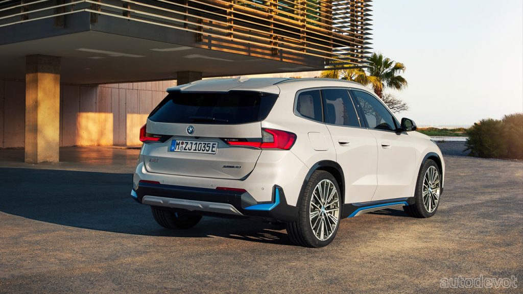 And of course, we also have the first-ever iX1, expected to be available in November 2022 in a single iX1 xDrive30 variant. It packs two electric motors, one at each axle, offering combined figures of 230 kW (313 metric hp) and 494 Nm (364 lb-ft). In fact, the combined power output is 200 kW (272 metric hp), but you get a 30 kW (41 metric hp) temporary boost. But anyway, a 64.7 kWh (usable) battery pack is claimed to offer a WLTP range of up to 438 km (272 mi). The battery pack can be DC fast-charged with up to 130 kW. As for the official performance figures, the 0-100 km/h (62 mph) sprint time is 5.7 seconds and the top speed is 180 km/h (112 mph).
