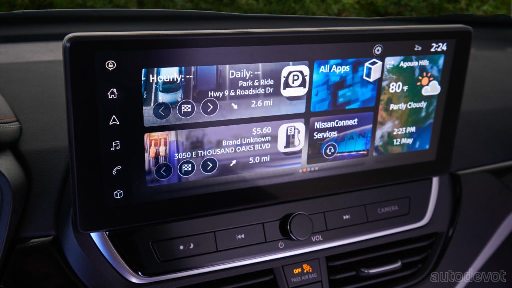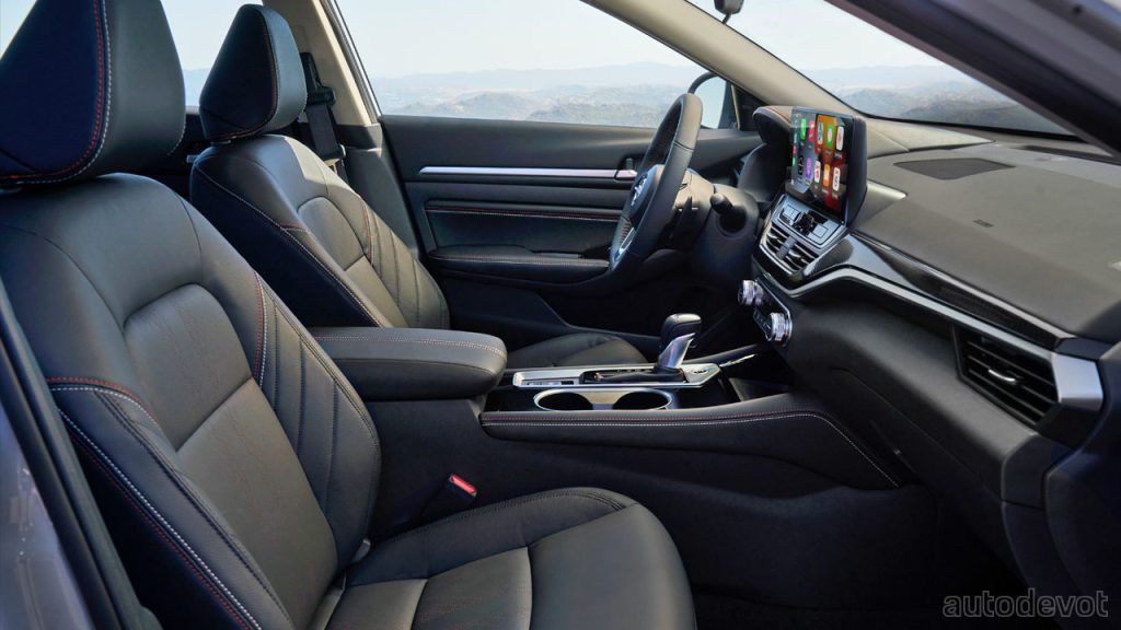 The refreshed interior features a 12.3-inch HD touchscreen, a 7.0-inch driver display, NASA-inspired Zero Gravity front seats, optional leather upholstery, optional 8-way power driver’s seat, Nissan Door-to-Door Navigation system, wireless Apple CarPlay, wireless smartphone charging pad, and WiFi hotspot. Further options include a 9-speaker Bose audio system, Active Noise Cancellation, Amazon Alexa, and NissanConnect Services (standard on Altima SL and SR Turbo).